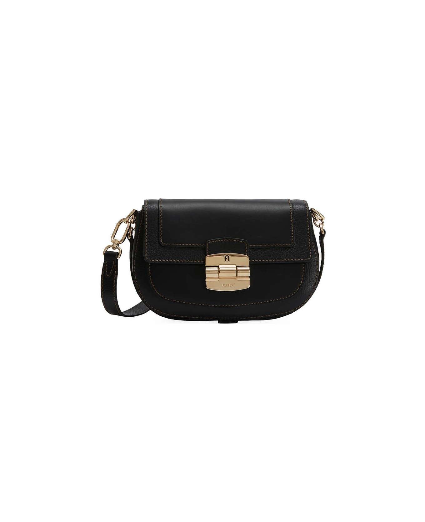 Cub 2 S crossbody bag by Furla made of textured leather and smooth leather in shades of black, featuring contrasting stitching, adjustable and removable shoulder strap and interlocking closure with logo. Slip pockets inside and at back. Measures 26x16x5 cm. Composition: 100% leather.