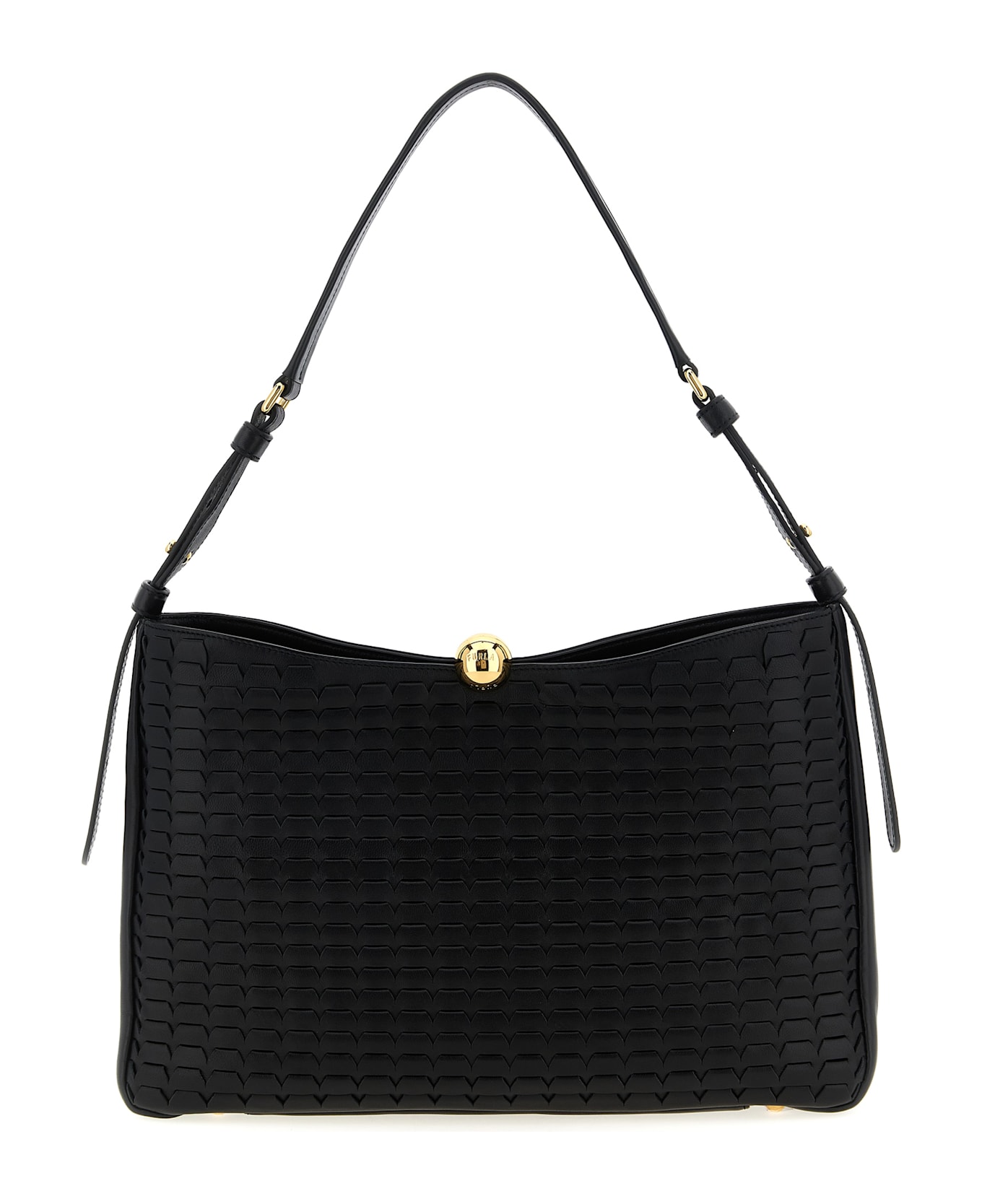 'Furla Sfera Soft' leather shoulder bag with woven front, magnetic closure with ball hardware, back embossed logo, adjustable handle, metal details. Composition: 100% sheepskin