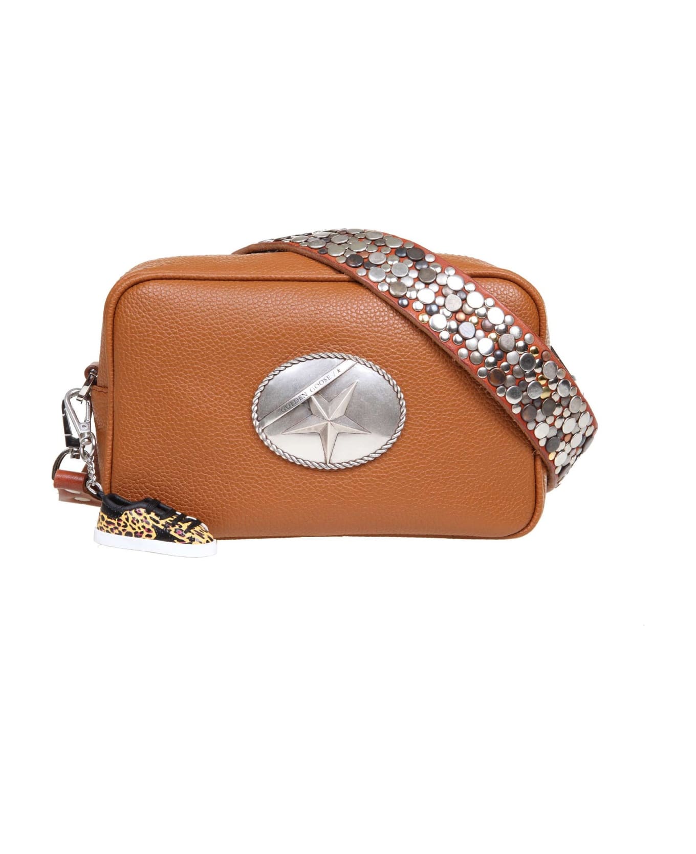 Leather shoulder bag leather color metal plate with embossed logo zip closure adjustable and removable leather shoulder strap with decorative studs fabric interior 1 inside pocket dimensions: length 22 cm height 14 cm depth 8 cm decorative keychain with sneakers composition: 100% calf leather, lining 100% nylon