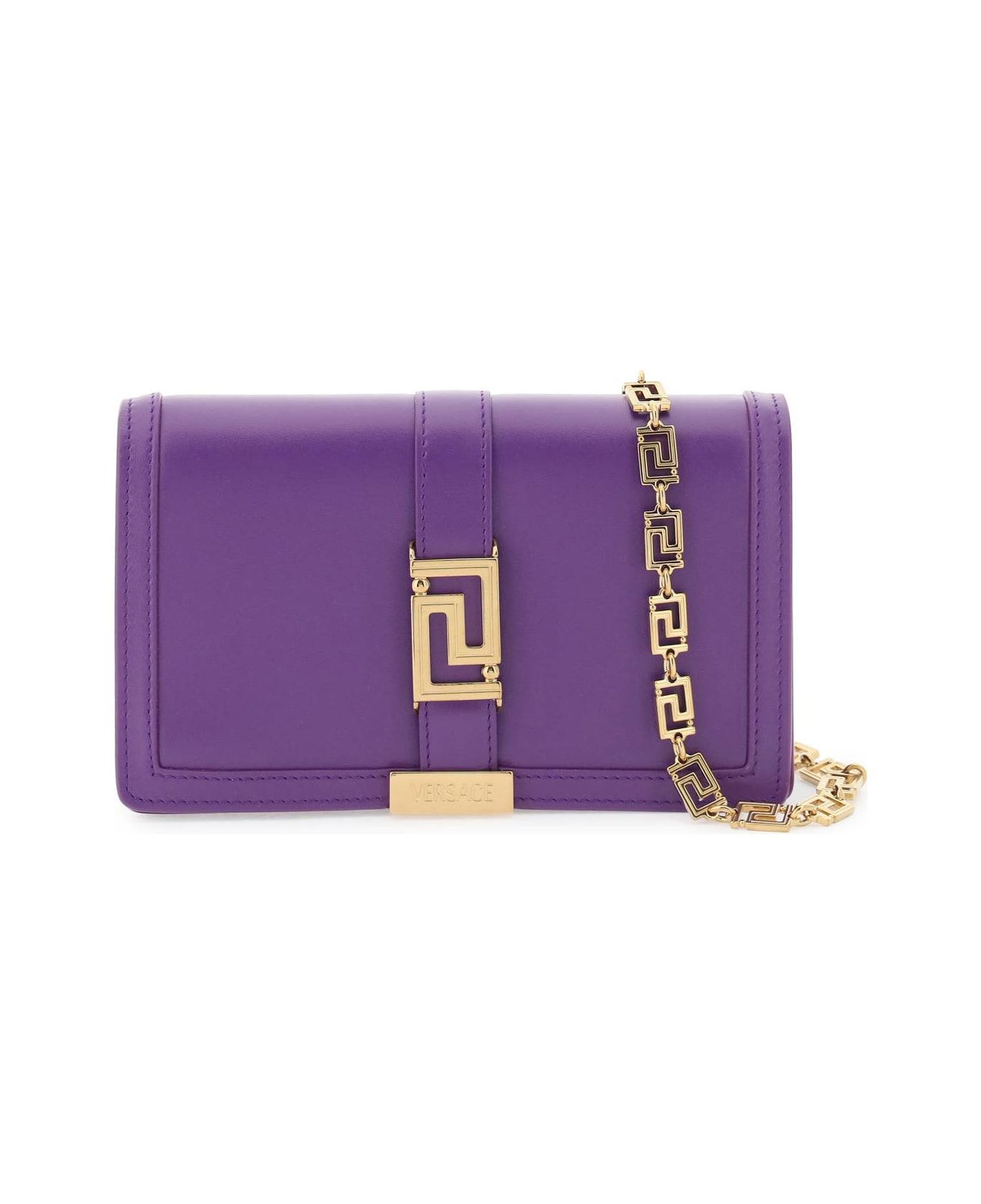 Greca Goddess crossbody bag by Versace made of leather and featuring the iconic Greca on the flap. Magnetic closure, leather interior with one main compartment, four credit card slots and one zippered pocket. Detachable shoulder strap with metal Greca and gold-finished metalware.