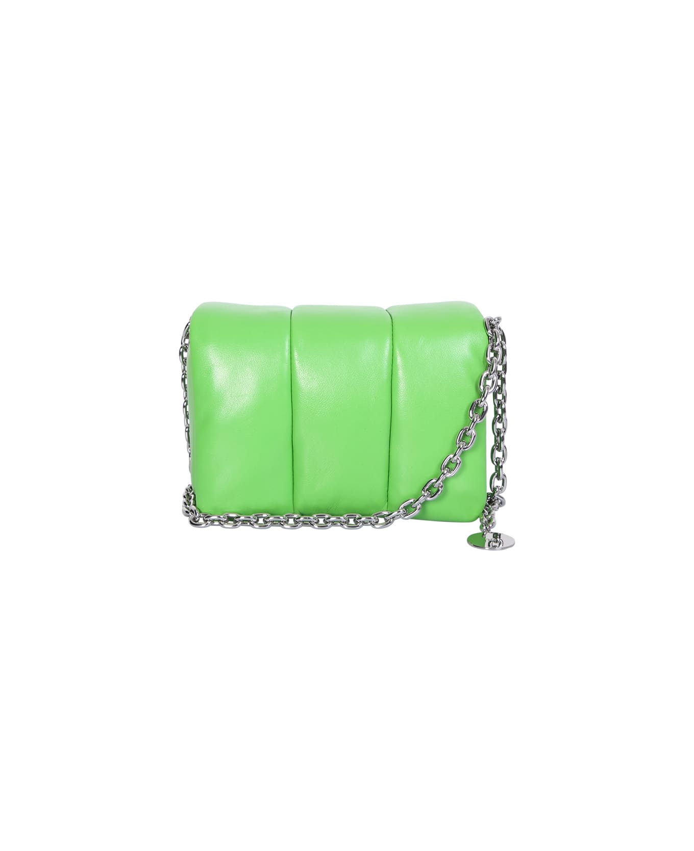 Foldover top. Magnetic fastening. Internal zip fastening pockets. Chain link shoulder strap. Padded design. Quilted. Silver tone hardware. Color: green