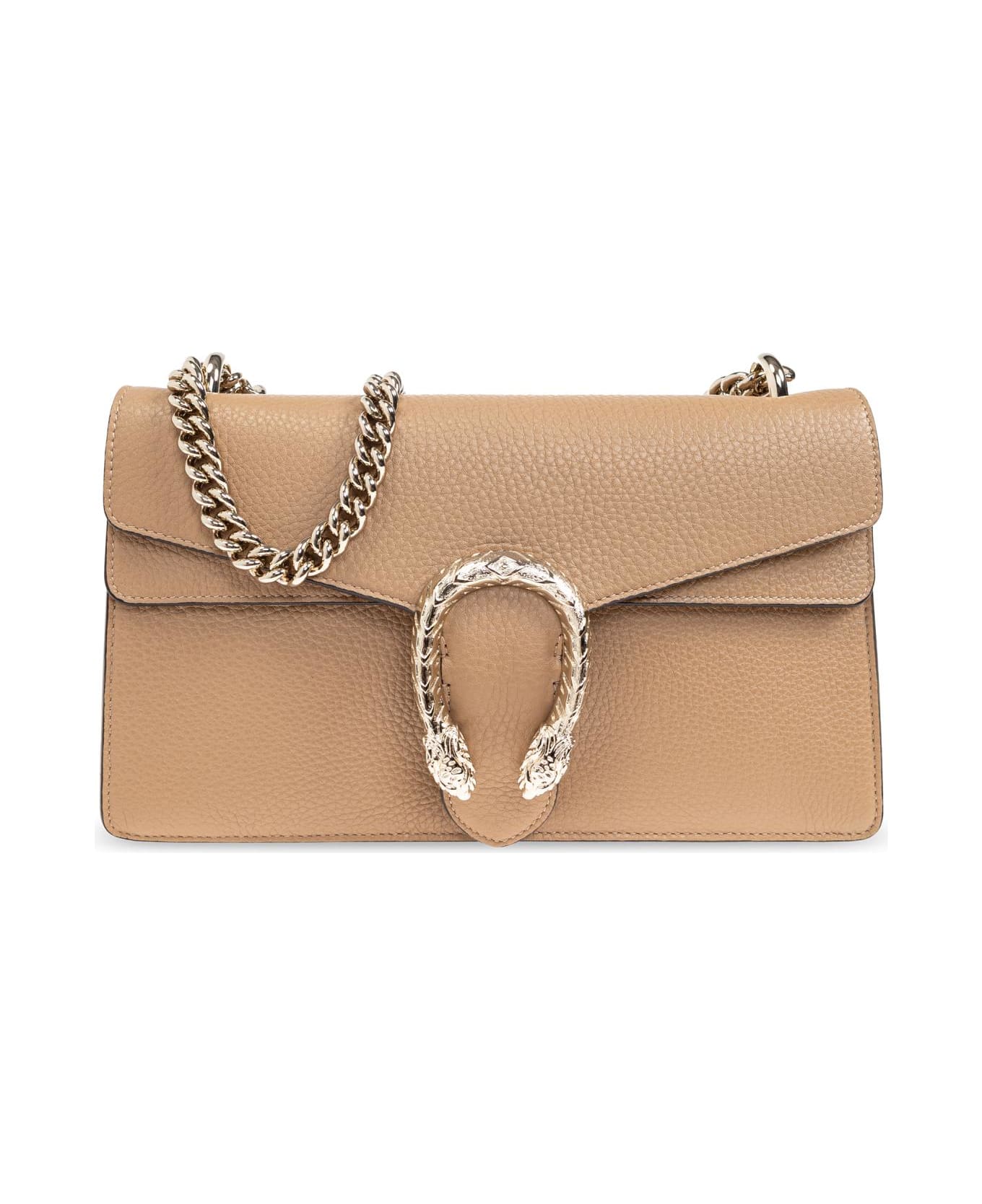 The Dionysus Medium Shoulder Bag by Gucci is the epitome of refined sophistication, distinguished by its subtly trapezoidal, rectangular silhouette. Meticulously crafted from premium, matte-finished grain leather, the bag presents a sleek beige exterior. The interior reveals an exquisite, suede-like light beige lining, providing a luxurious tactile experience. Timeless in appeal, this bag is graced with a signature silver-toned horseshoe clasp, featuring ornately detailed tiger heads a hallmark of the Dionysus lineage. The immaculate design is complemented by understated GUCCI branding, elegantly embossed on the inner flap. Ingenious structure meets classic styling, making it a truly distinctive accessory for those with a discerning taste. Why choose this product? Expertly crafted from high-quality, natural leather Iconic Dionysus hardware with intricately engraved details Signature design by Gucci's elite artisans Elegant interior, combining luxury with practicality Timeless beige tone suited for any sophisticated occasion