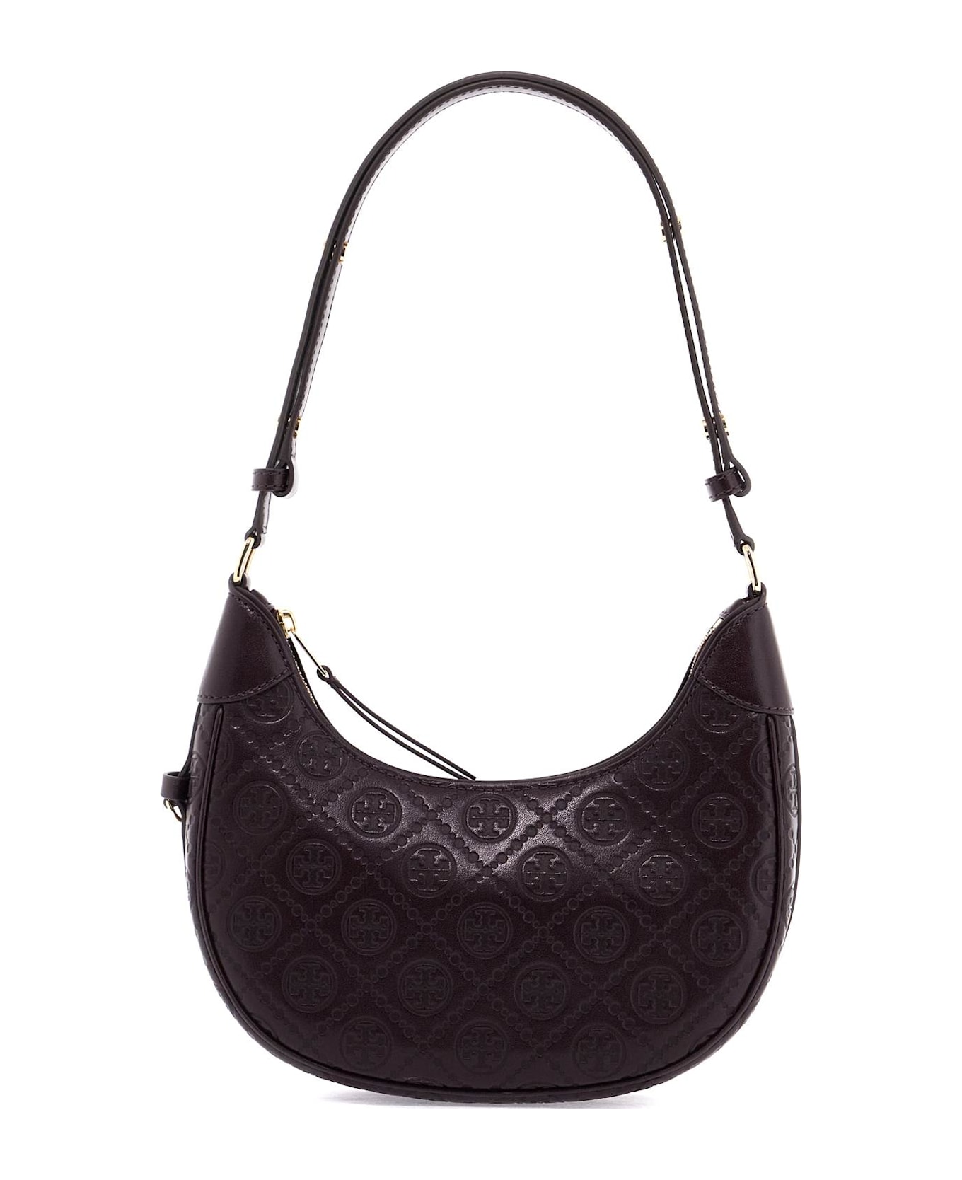 The Tory Burch half-moon bag is made of glossy leather with an all-over T Monogram print. It features a top zip closure, microsuede lining with an open pocket, and an adjustable handle. The side has a mini D-ring and gold-finished metal accessories.