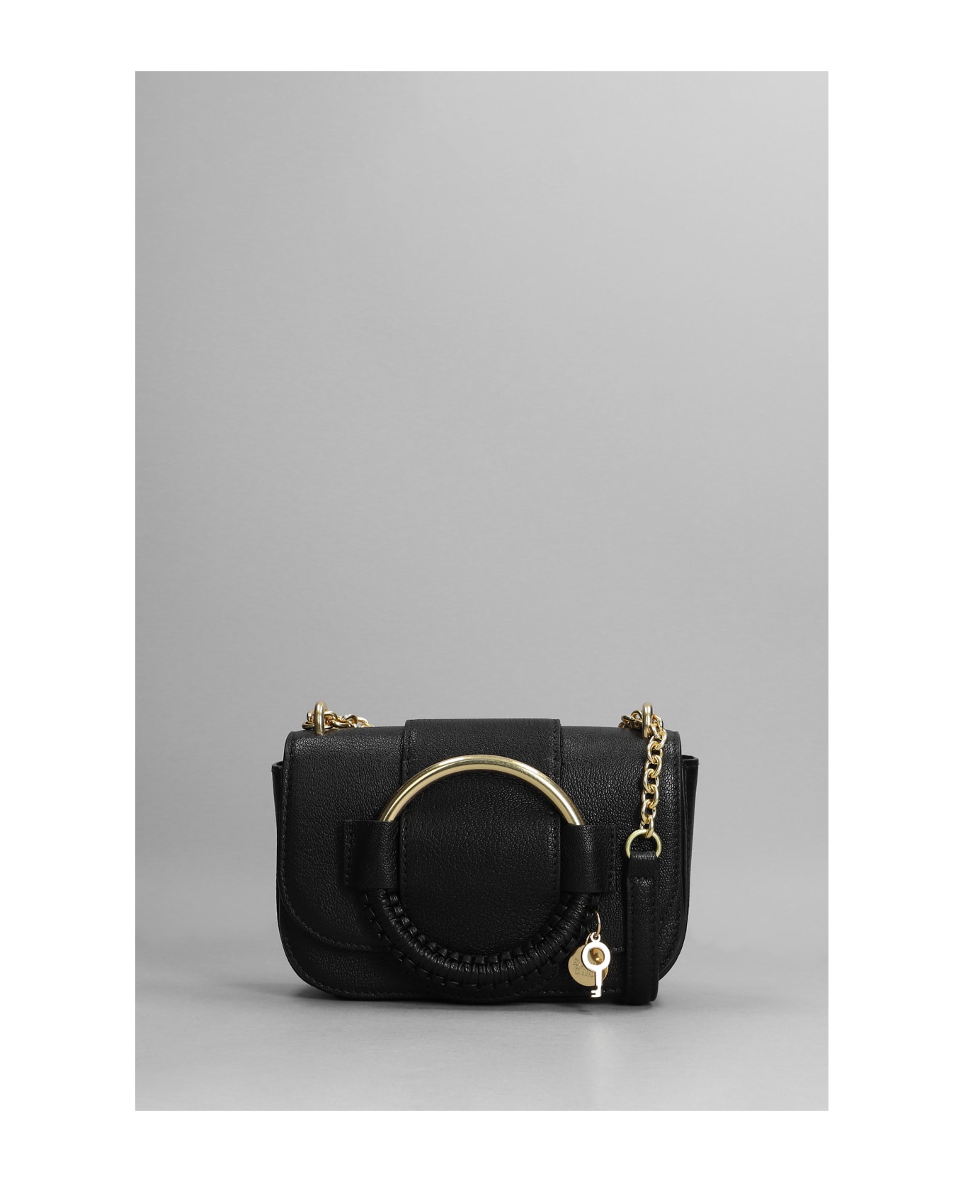Hana sbc Shoulder bag in black leather, Height 110 mm, Width 185 mm, Width 185 mm, chain and leather carry, magnetic closure, gold rings detail, 100% leather, Made in India