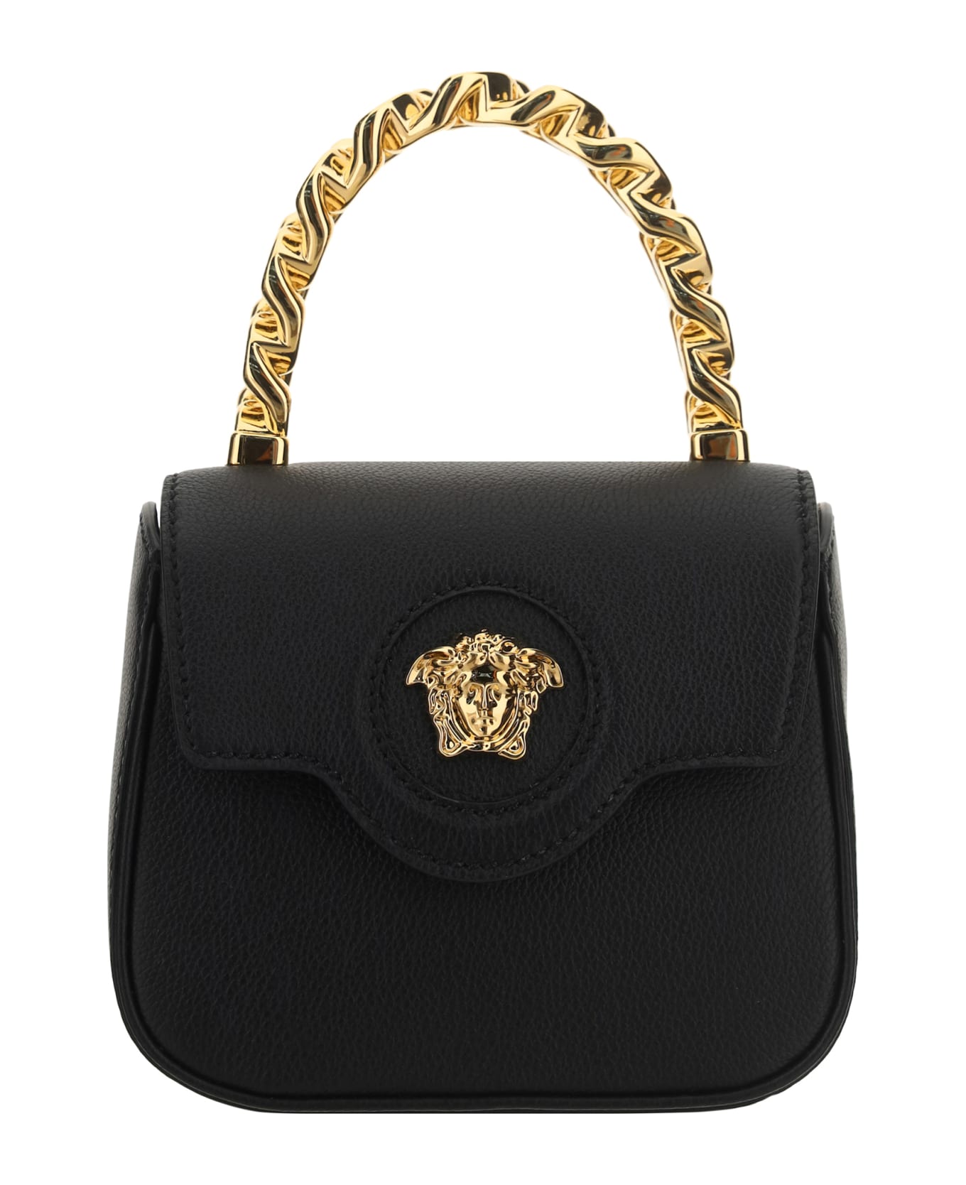 Calfskin handbag by gianni versace, front flap closure with magnetic button, patch with iconic medusa head embossed on front, internal card slot, adjustable and removable shoulder strap, single rigid gold-plated handle.