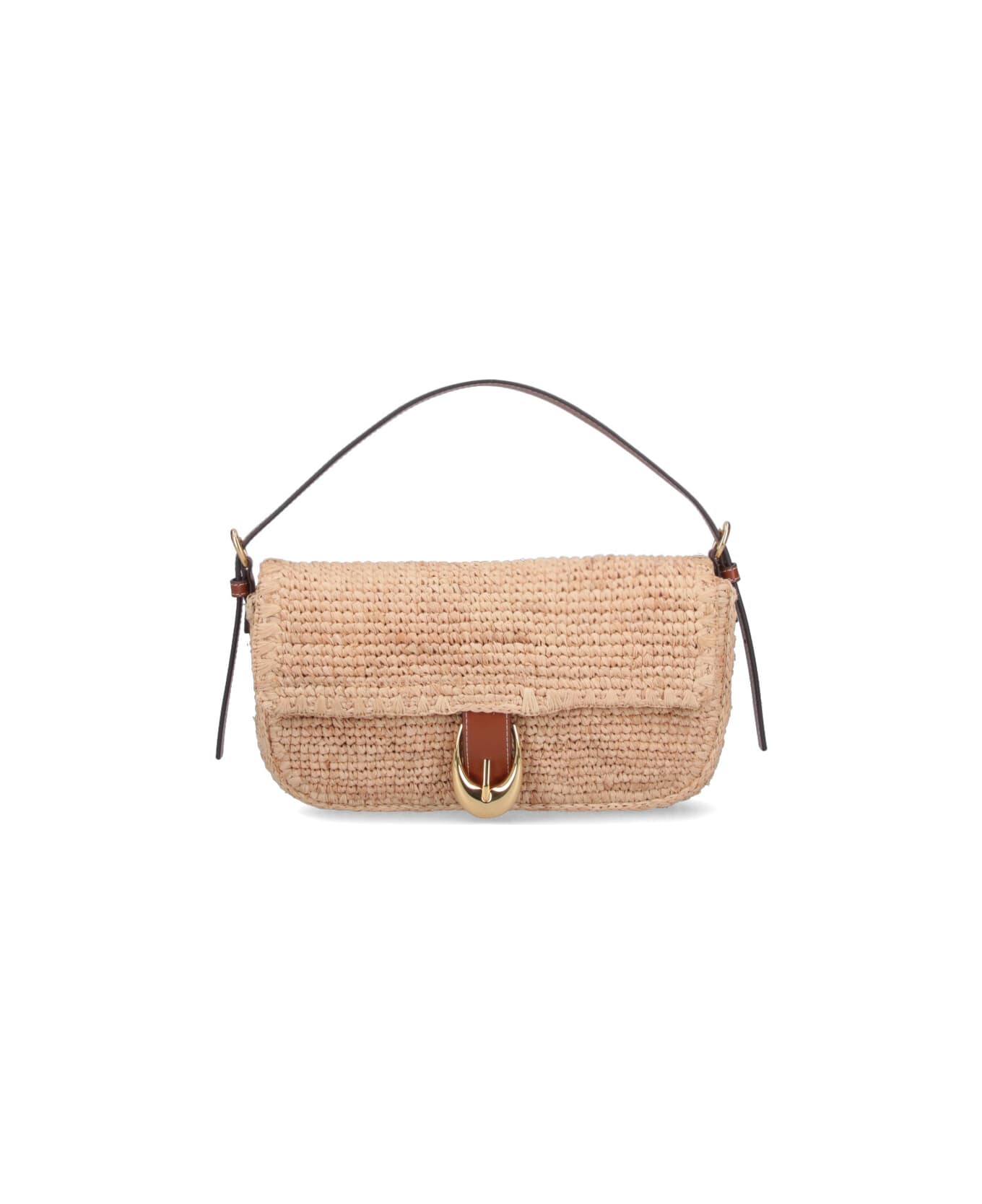 Staud 'Harlow' shoulder bag in beige raffia with leather trim, adjustable handle, strap flap closure with gold metal buckle, leather patch with embossed logo on the back, inner slip pocket, main inner compartment.