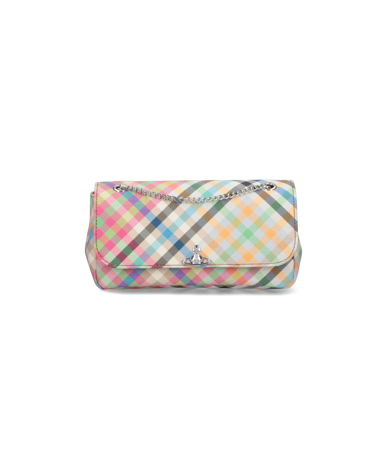 Vivienne Westwood hazel shoulder bag in multicolor fabric, all-over "tartan" pattern, adjustable silver metal top shoulder strap, front button flap closure, silver metal orb logo on the front, one single inner compartment.