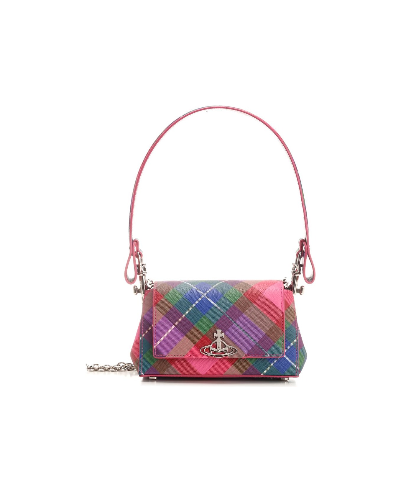 "Hazel" Small bag from Vivienne Westwood with Tartan Candy motif in bright tones and Union Jack lining. Magnetic closure with metal Orb, embossed Saffiano finish, detachable chain shoulder strap. Composition: 65% Polyurethane 20% Polyester 15% Cotton