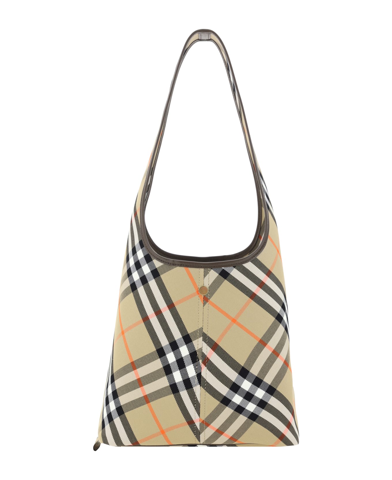 Hobo shoulder bag by burberry, unique structured design, leather trim and inserts, features removable and zippered interior pouch, iconic all-over repeated check pattern of the brand.