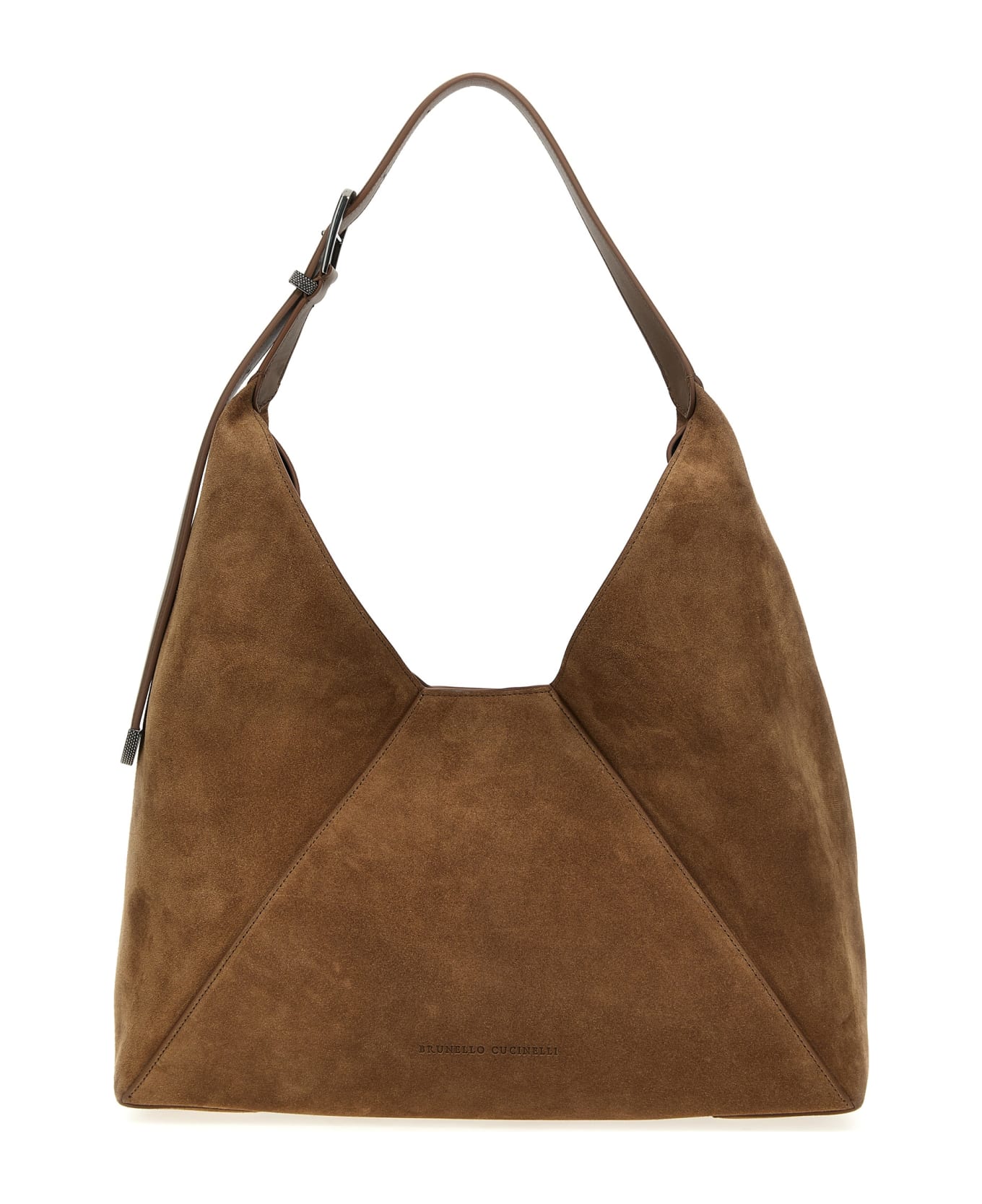 Hobo shoulder bag in suede and leather, adjustable handle, magnetic closure.