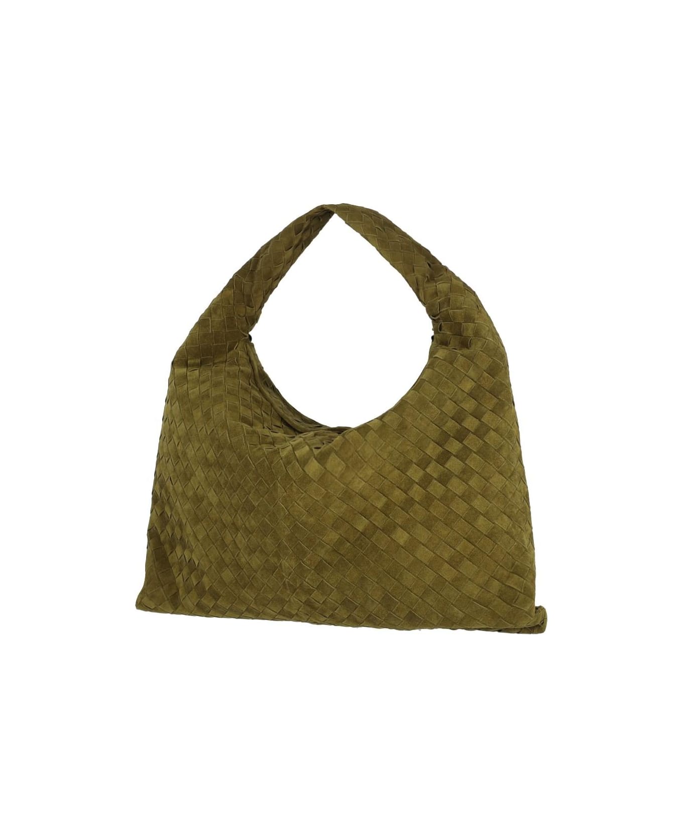 Bottega Veneta 'Hop' large shoulder bag in green suede with woven design, top handle, magnetic closure, inner compartment.