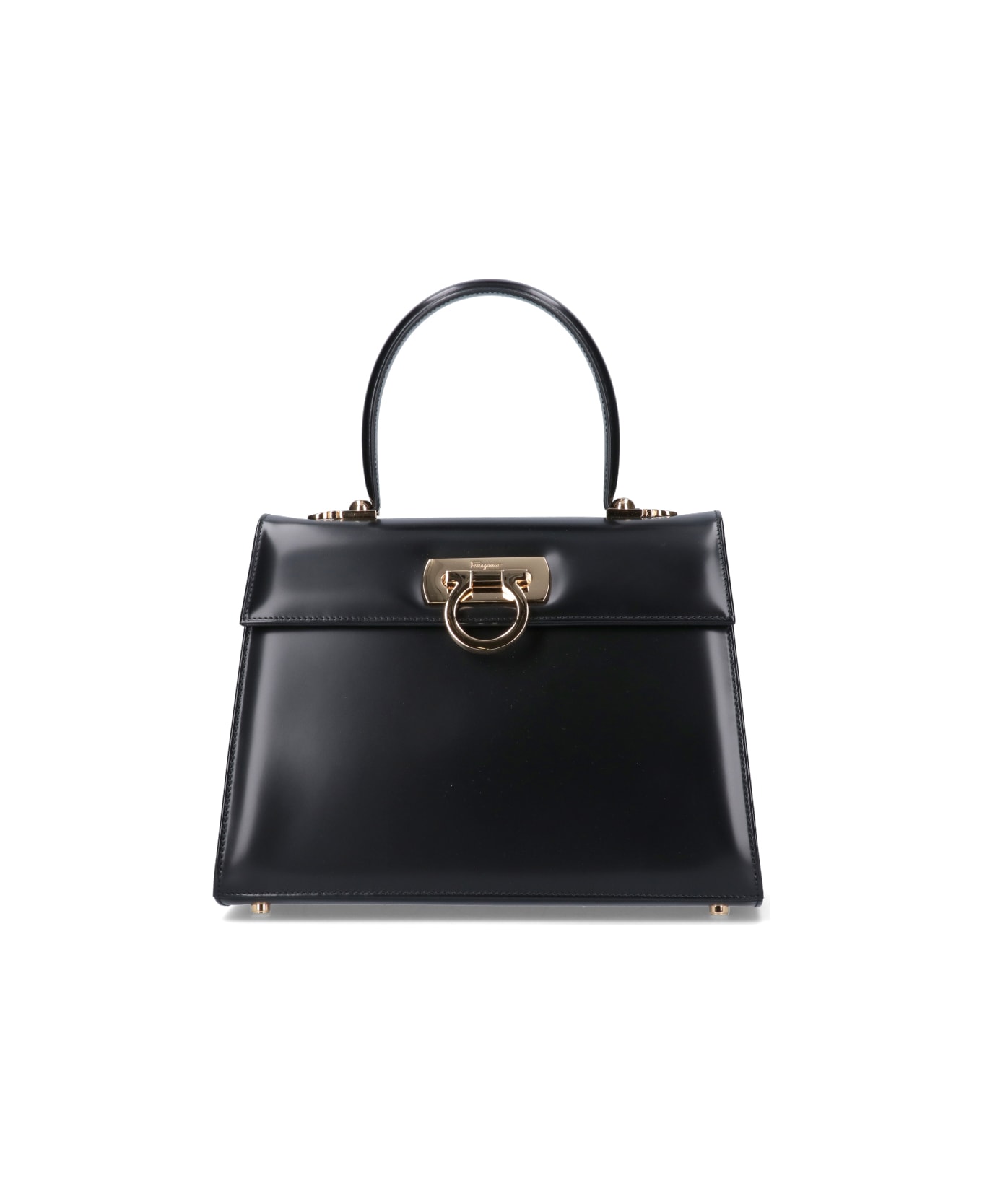 Ferragamo Iconic Top Handle large bag in black brushed leather with rigid top handle, adjustable and removable shoulder strap, flap closure with Gancini spin buckle, two separate inner compartments, an inner zip pocket, gold metal feet on the bottom. Composition: 100% Calf Leather