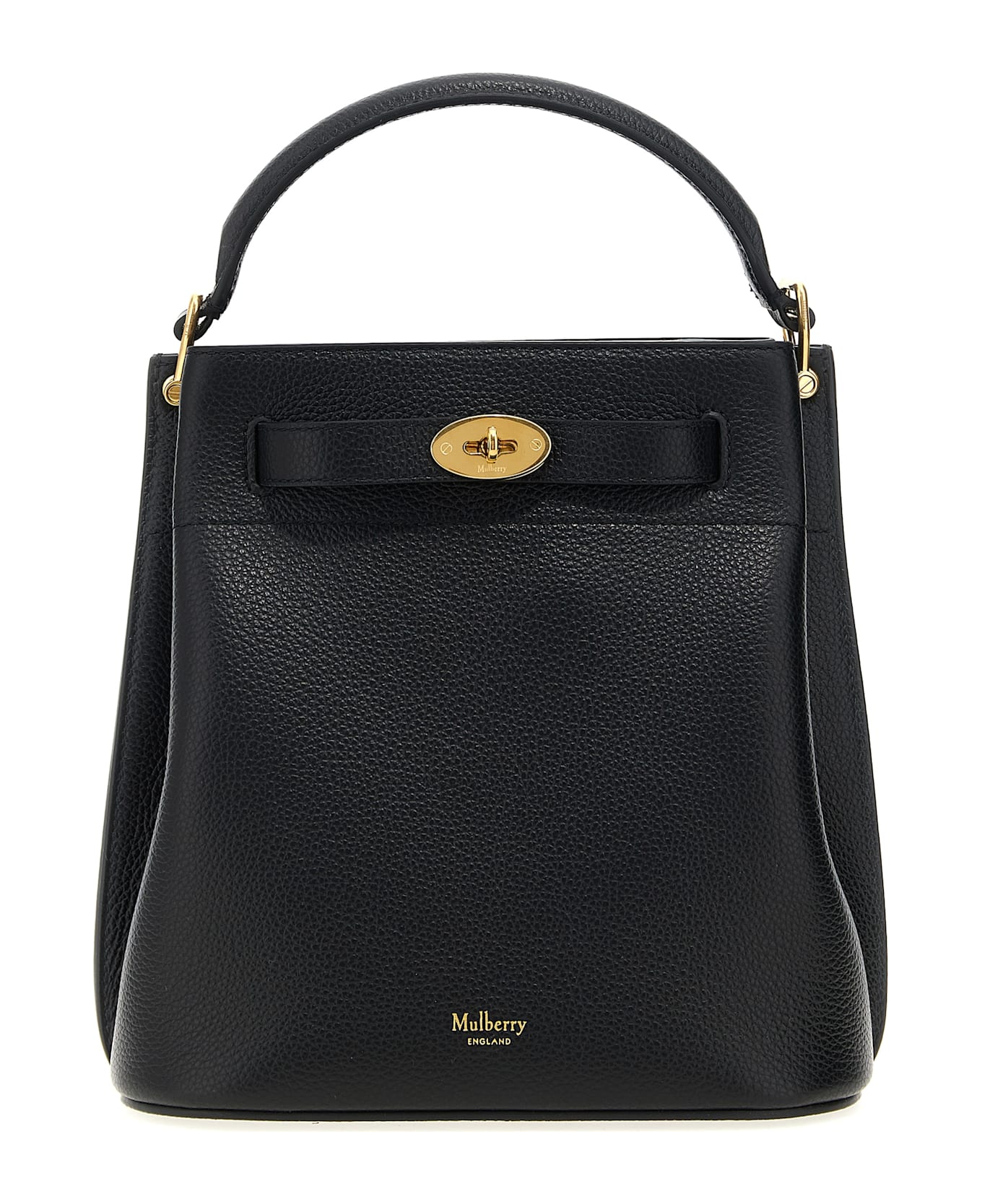 Small Islington bucket bag in hammered leather with front embossed logo, belt closure with metal Postman's Lock, fixed handle, adjustable shoulder strap, and metal details.