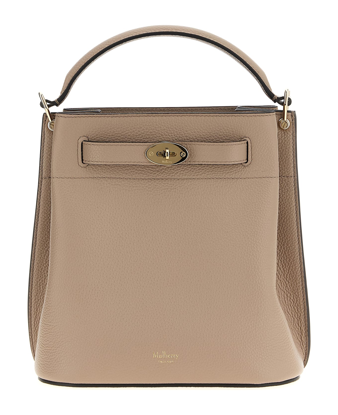 Small 'Islington' bucket bag in hammered leather, front embossed logo, belt closure with metal Postman's Lock, fixed handle, adjustable shoulder strap, and metal details.