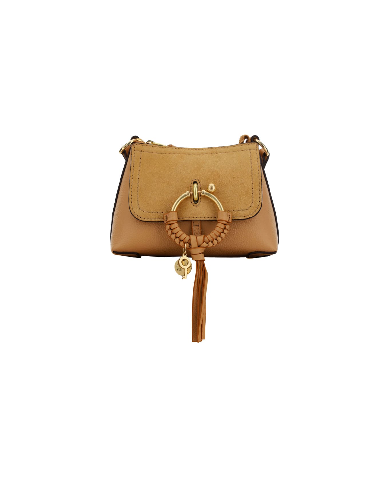 Calfskin joan shoulder bag by see by chloé, grained leather design, suede front flap, iconic gold-plated detail on front closure with hanging leather tassel, top zipper closure, removable and adjustable flat leather shoulder strap, single interior compartment, interior welt pockets.