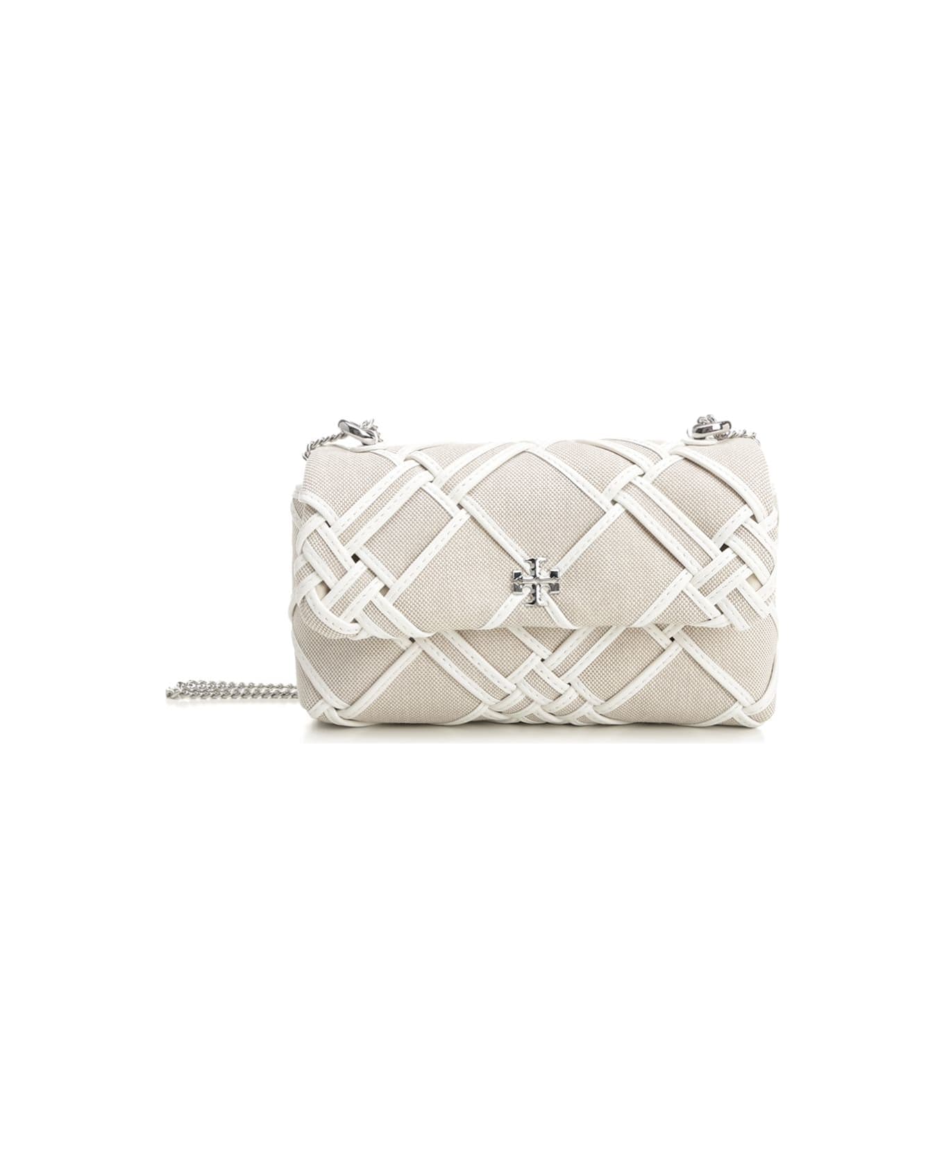 "Kira" mini bag by Tory Burch in woven canvas with contrasting leather details, flap with magnetic closure, chain shoulder strap, internal card pocket.