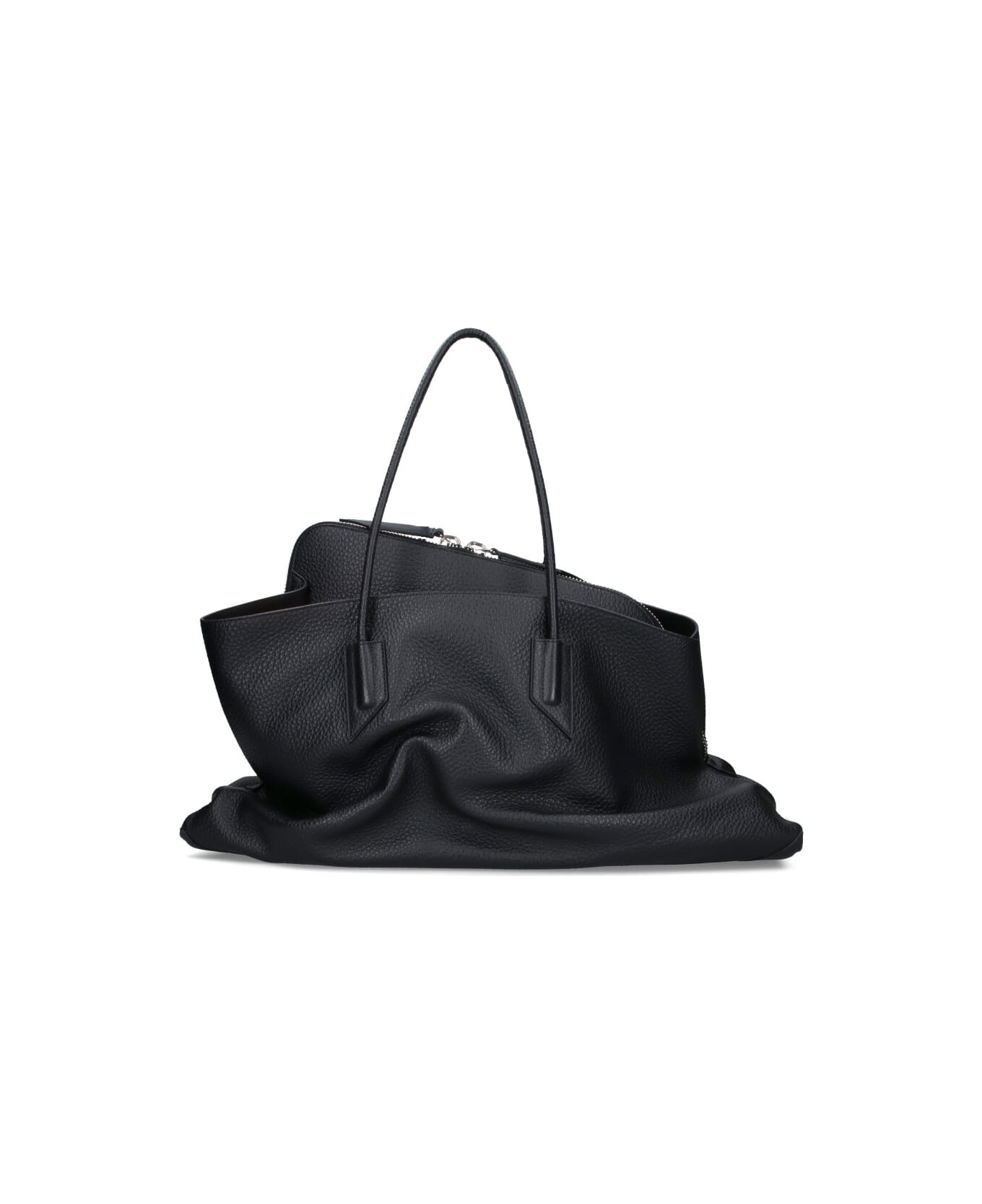 The Attico 'La Passeggiata' large shoulder bag in black hammered calf leather with two top handles, double zip closure, tonal logo on the front, three main inner compartments, one inner card slot. Composition: 100% Calf Leather