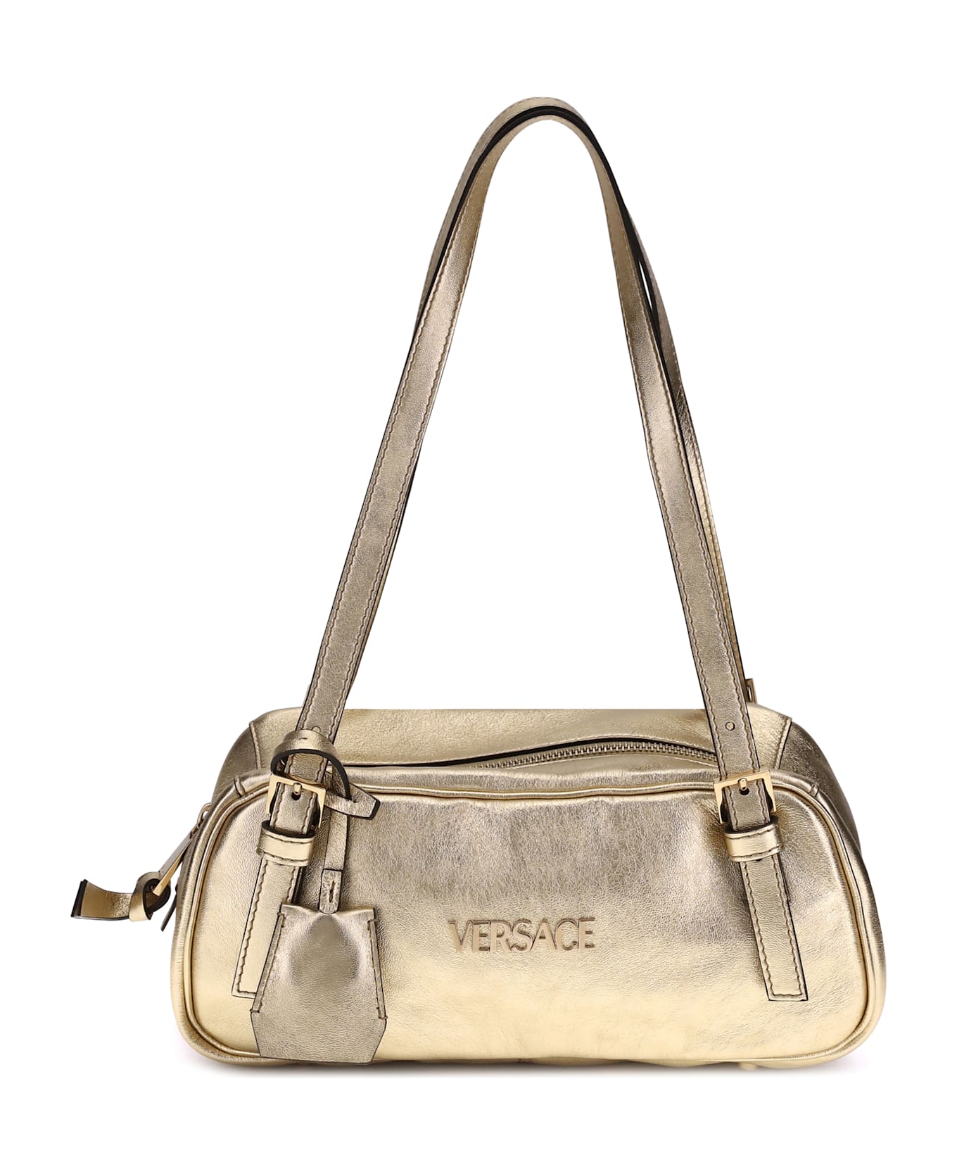 The versace bowling shoulder bag, crafted from laminated metallic nappa, combines style and versatility. embellished with the versace logo in metal, it features adjustable leather handles that allow it to be worn comfortably over the shoulder. the design is completed with a removable leather key ring, embellished with the famous medusa detail, the iconic symbol of the maison.