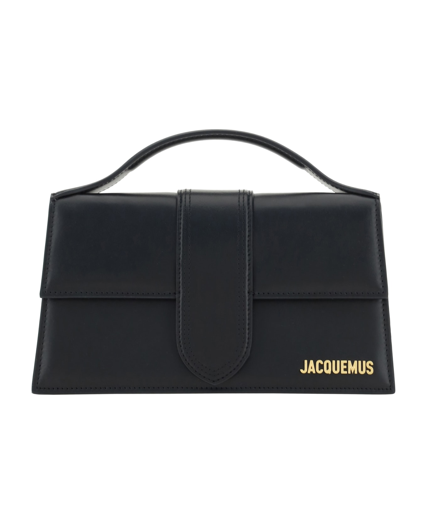 Calfskin le grand bambino handbag by jacquemus, featuring a flat top handle, an adjustable and removable shoulder strap, a three-dimensional plaque with iconic brand monogram applied in contrast on the front, a patch welt pocket on the back, a geometric design, and a flap with a magnetic button for closure on the front.