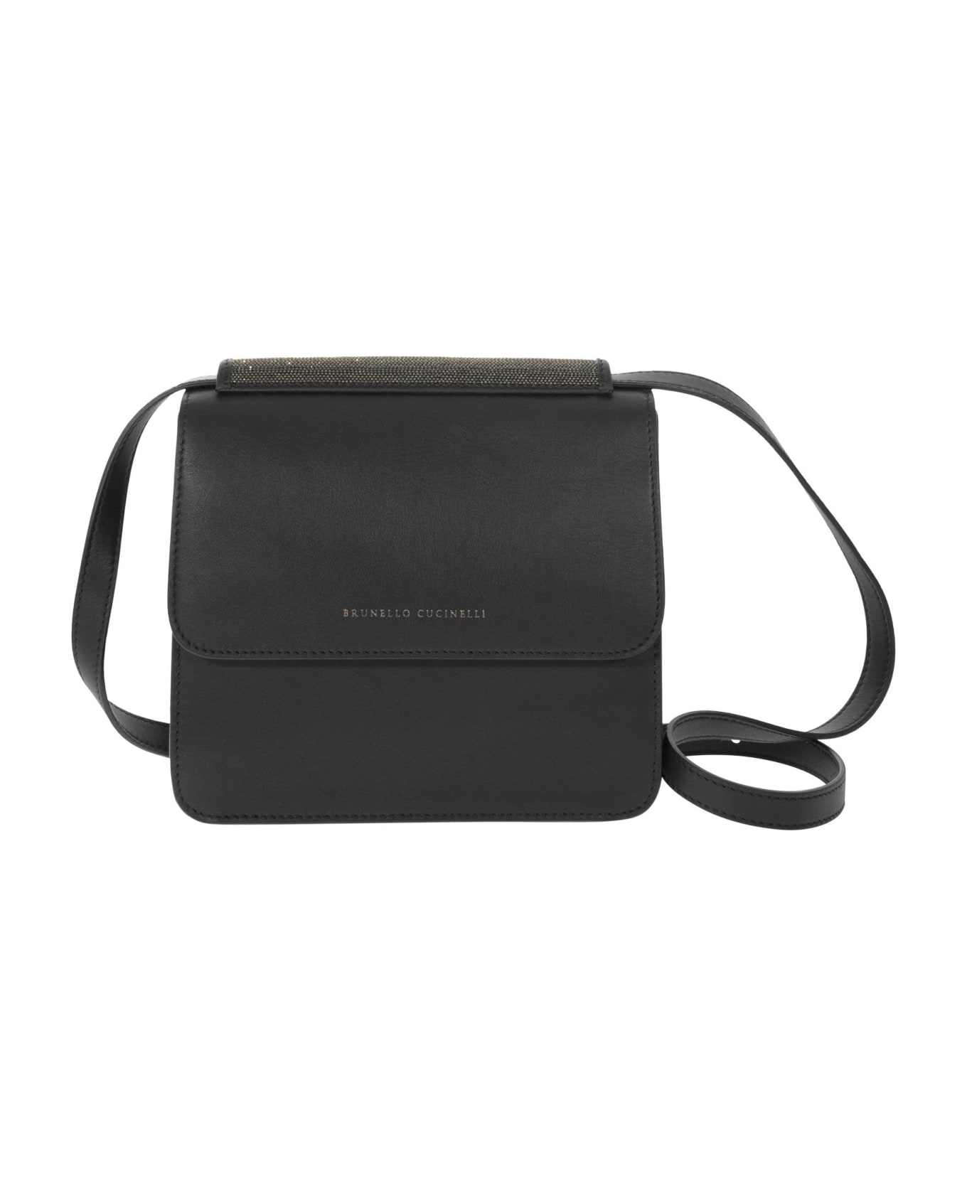 The compact, ultra-soft silhouette of the new leather bag is the result of a combination of fine materials and refined details. On the smooth texture of the accessory stands out the wide upper band composed of stripes of bright monile, an iconic decoration of the Brunello Cucinelli collections. The leather lining and the adjustable and removable shoulder strap complete the style with practical and comfortable details. - Flap closure with magnets - Adjustable and removable shoulder strap - Leather lining - Internal zipped compartment - Nickel-free jewel decoration DESIGNER ID: MBRLD2370 C101 Composition: 100% Leather Application: Brass diamond necklace