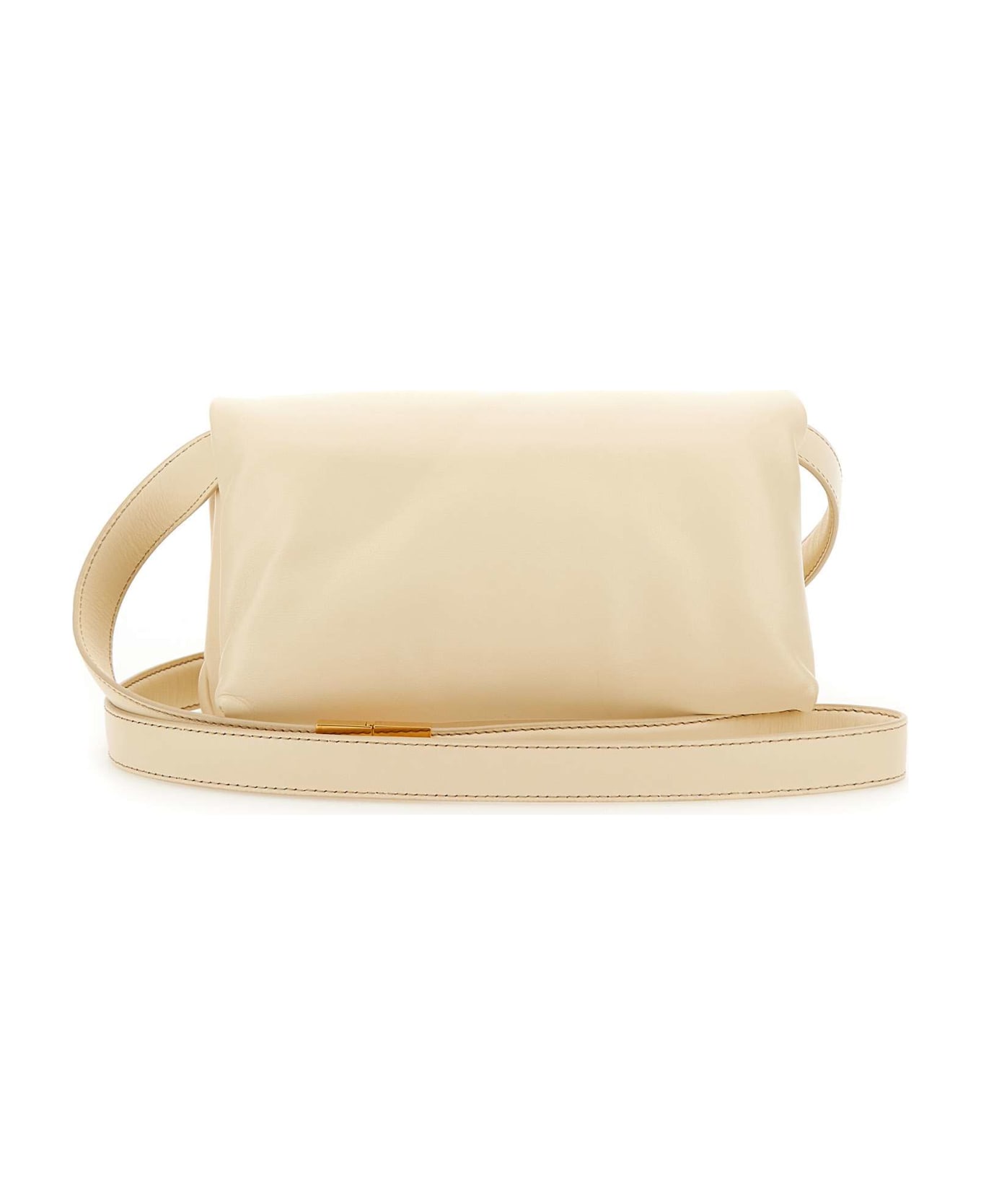 Marni women's soft smooth leather sholder bag, butter color, padded design, internal compartment with partition closed by zip, gold metallic finishes, gold logo embossed on back, 90cm shoulder strap, flap and snap fastening. Dimensions: height 11cm, width 21cm, depth 9cm. Made in Italy.