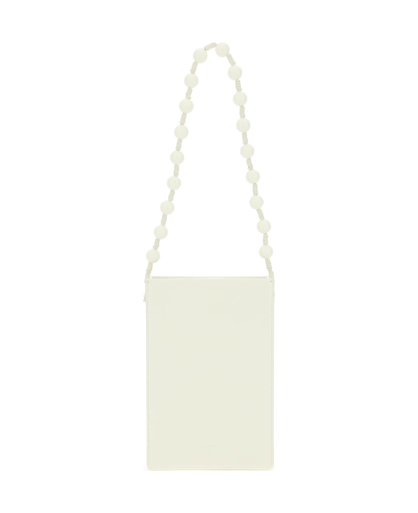 Low Classic leather bag featuring a rectangular shape and a handle made with large beads. Bridge closure with press button. Suede interior with a smooth leather flat pocket.