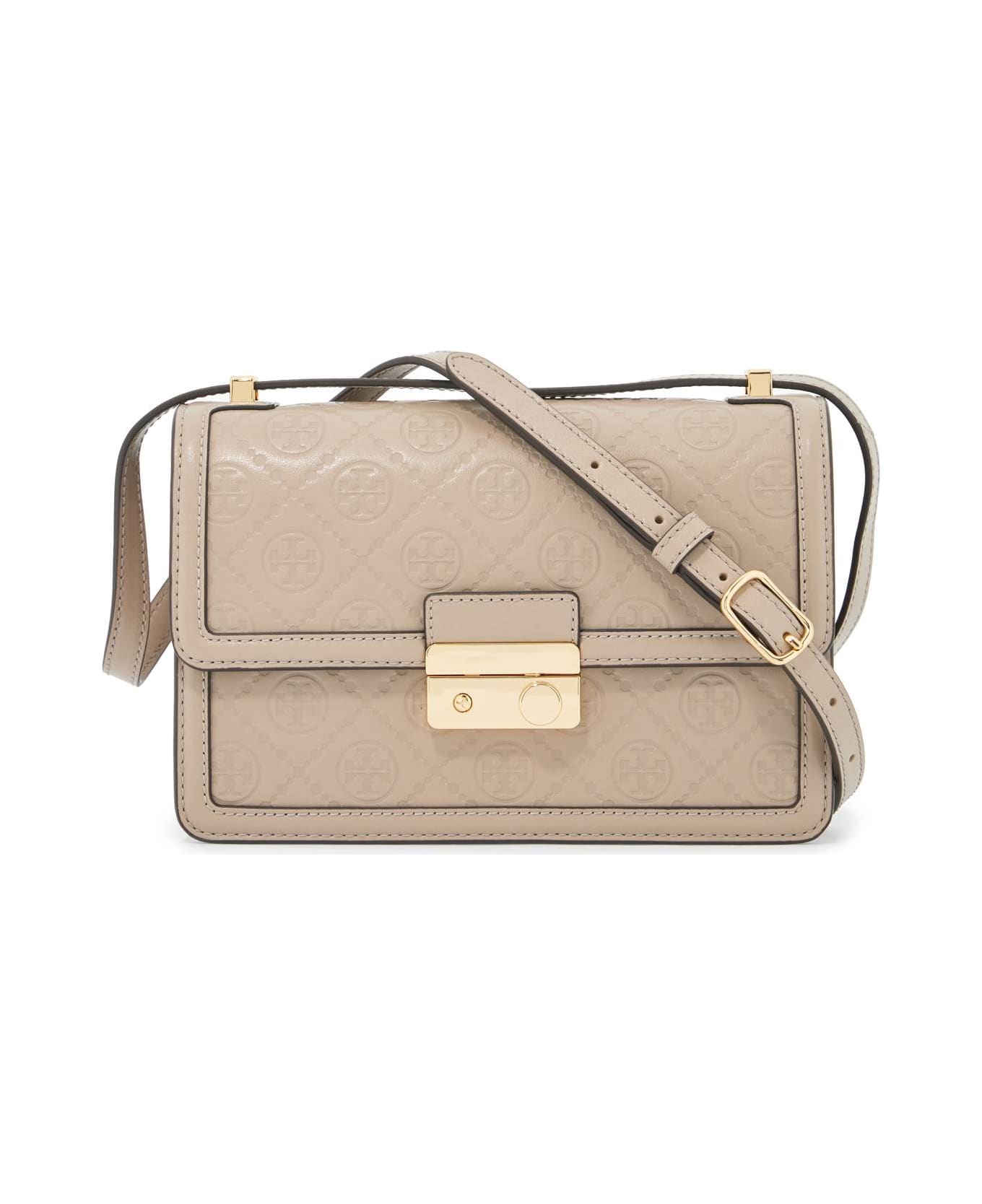 The Tory Burch shoulder bag is made of smooth full-grain leather with the iconic double T motif printed all over. The structured design features a snap closure on the flap, one flat pocket, two expandable compartments divided by a zippered pocket, and an adjustable and convertible handle that can be worn as a crossbody. The metal accessories have a gold finish for a touch of elegance.