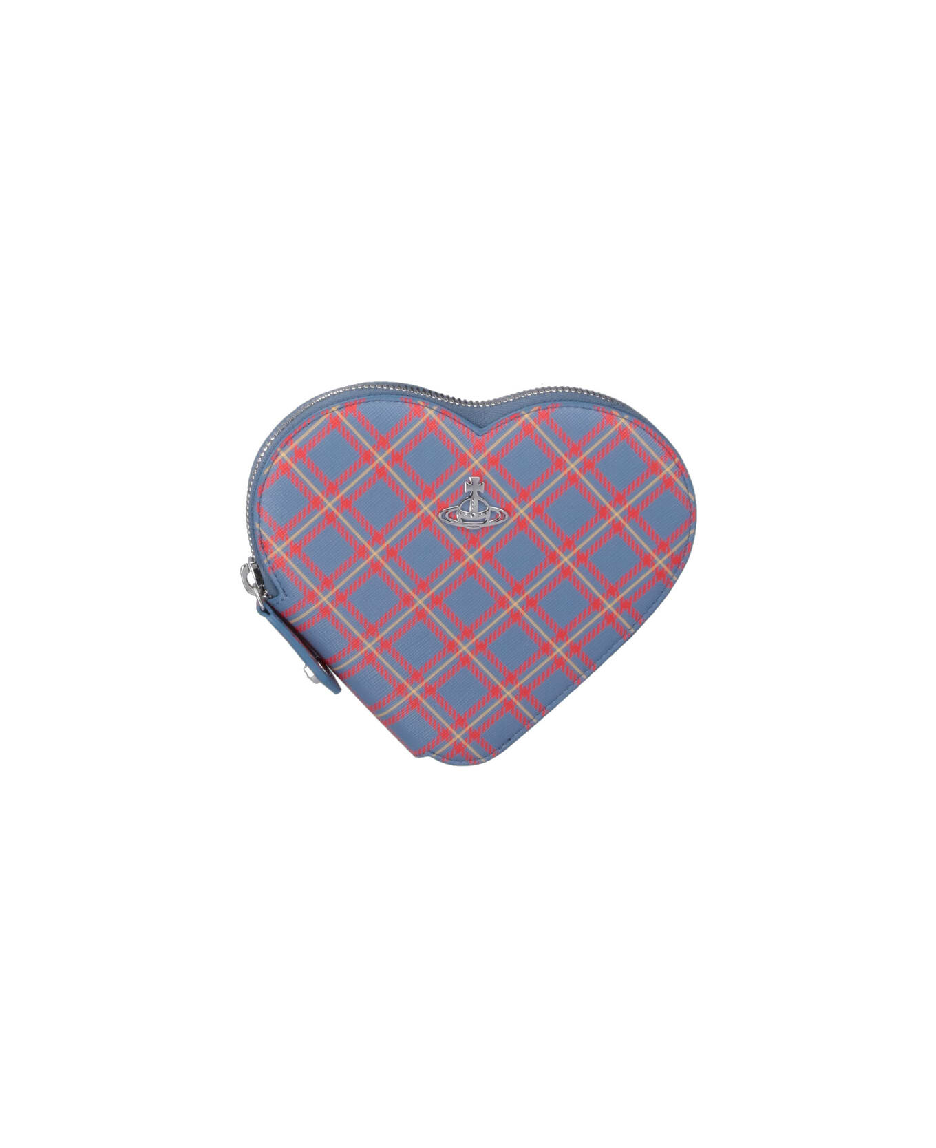 Vivienne Westwood "Louise Heart" crossbody bag in multicolor cotton blend, tartan pattern, Saffiano leather trims, heart design, removable silver metal chain shoulder strap, zip closure, silver metal "Orb" logo on the front, a single inner compartment.