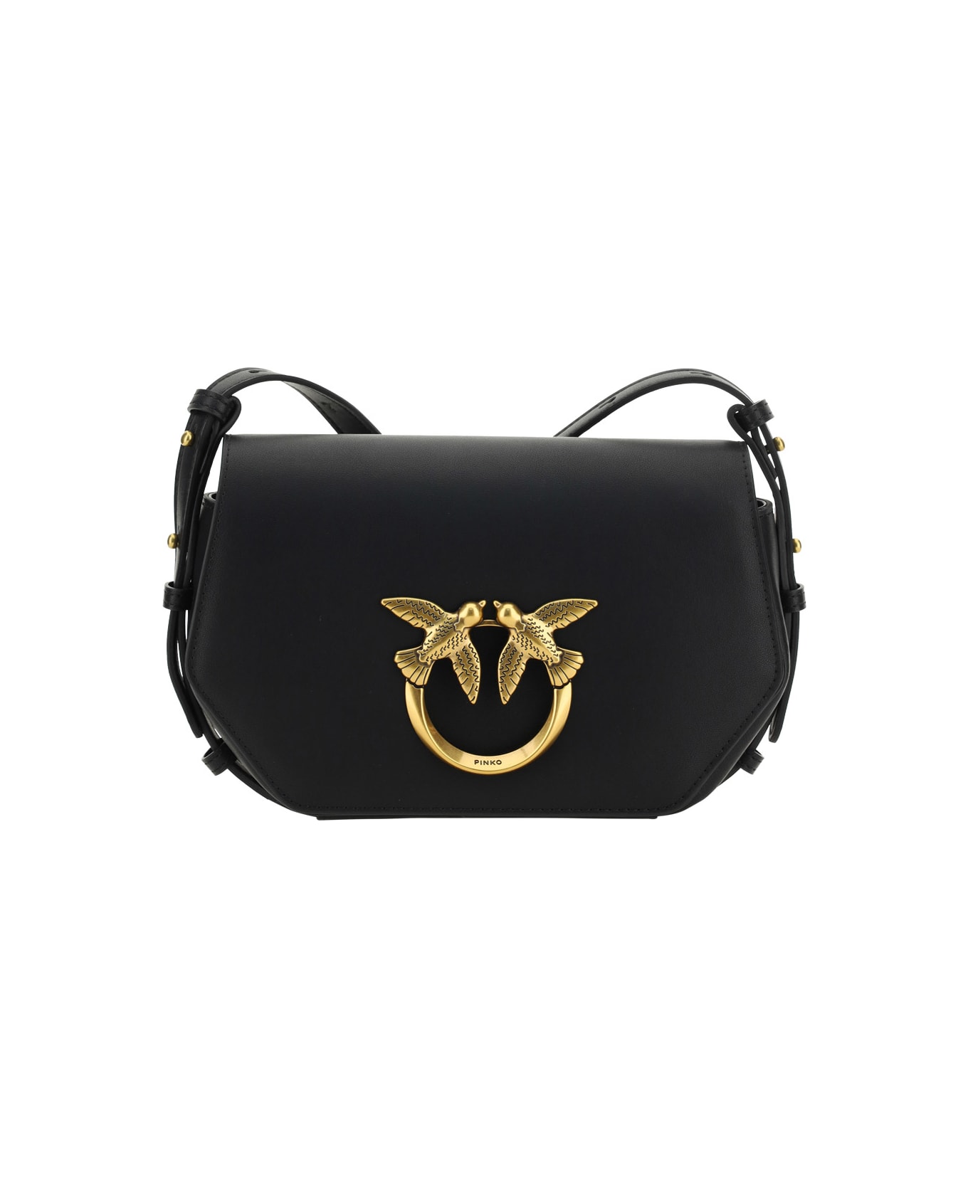 Calfskin love exagon bag by pinko, square geometric shape, front closure with magnetic flap, gold-plated and embossed iconic love birds logo plaque on the front, double internal compartment, sliding chain shoulder strap, iconic tone-on-tone embroidered brand monogram on the back.