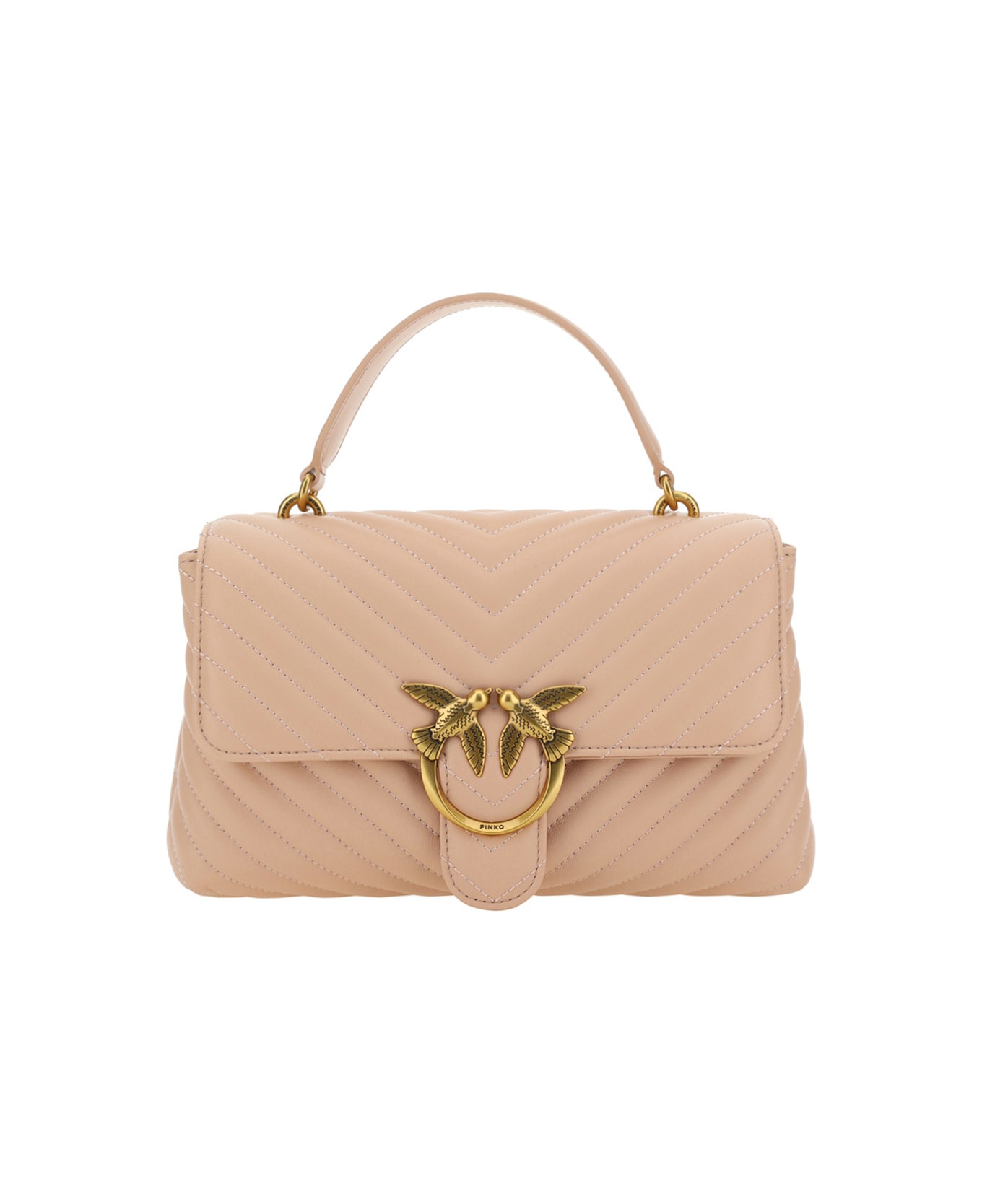 Calfskin love lady shoulder bag by pinko, front magnetic button closure, iconic gold-plated and embossed love birds logo on front, quilted and padded design, double interior compartment, sliding chain shoulder strap, flat rigid handle at top, interior flat pocket with zipper, iconic tone-on-tone embroidered brand monogram on back.