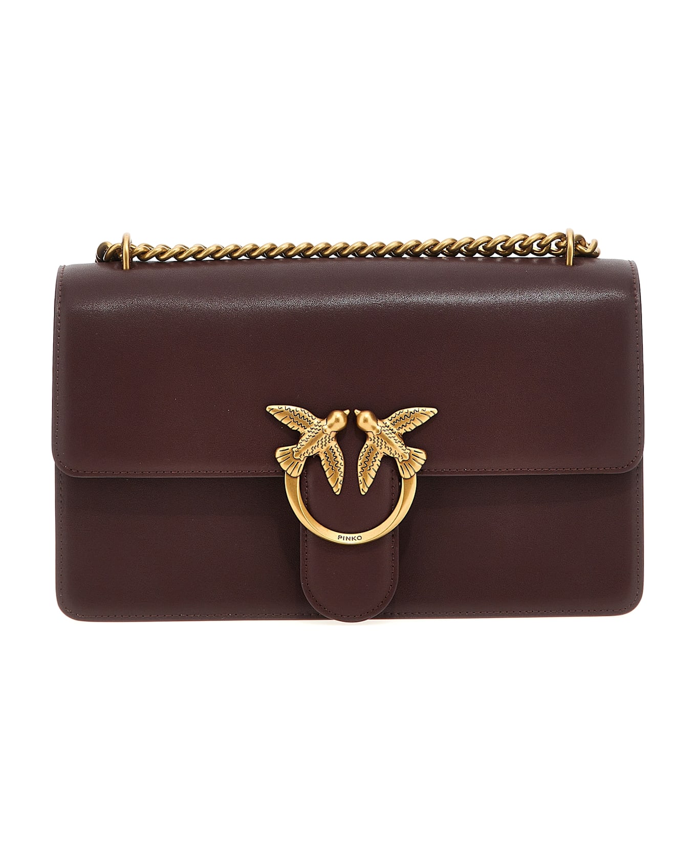 'Love One Classic Simply' leather crossbody bag, magnetic flap closure with front metal logo appliqué, adjustable leather and chain shoulder strap.