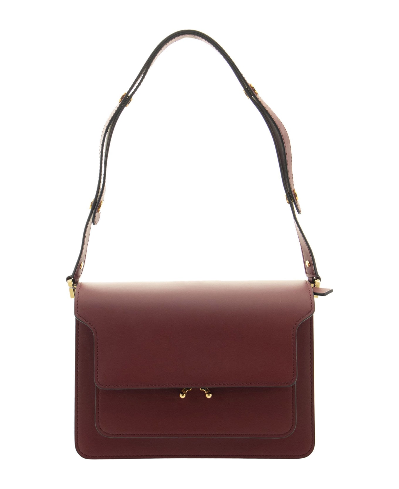 The typical Marni Trunk bag, a house classic, appears in a burgundy color which gives it a timeless touch. It is made in Italy in leather, the upper flap opens to reveal four gusseted compartments. - Mono-coloured shoulder bag - Back pocket and inside pocket - 5 internal compartments - 2 of which with zip - Gold-tone metal fastening - Shoulder strap with extension - Painted piping DESIGNER ID: SBMPN09NO1 LV583 ZR80N Composition: 95% Bovine 5% Real Brass