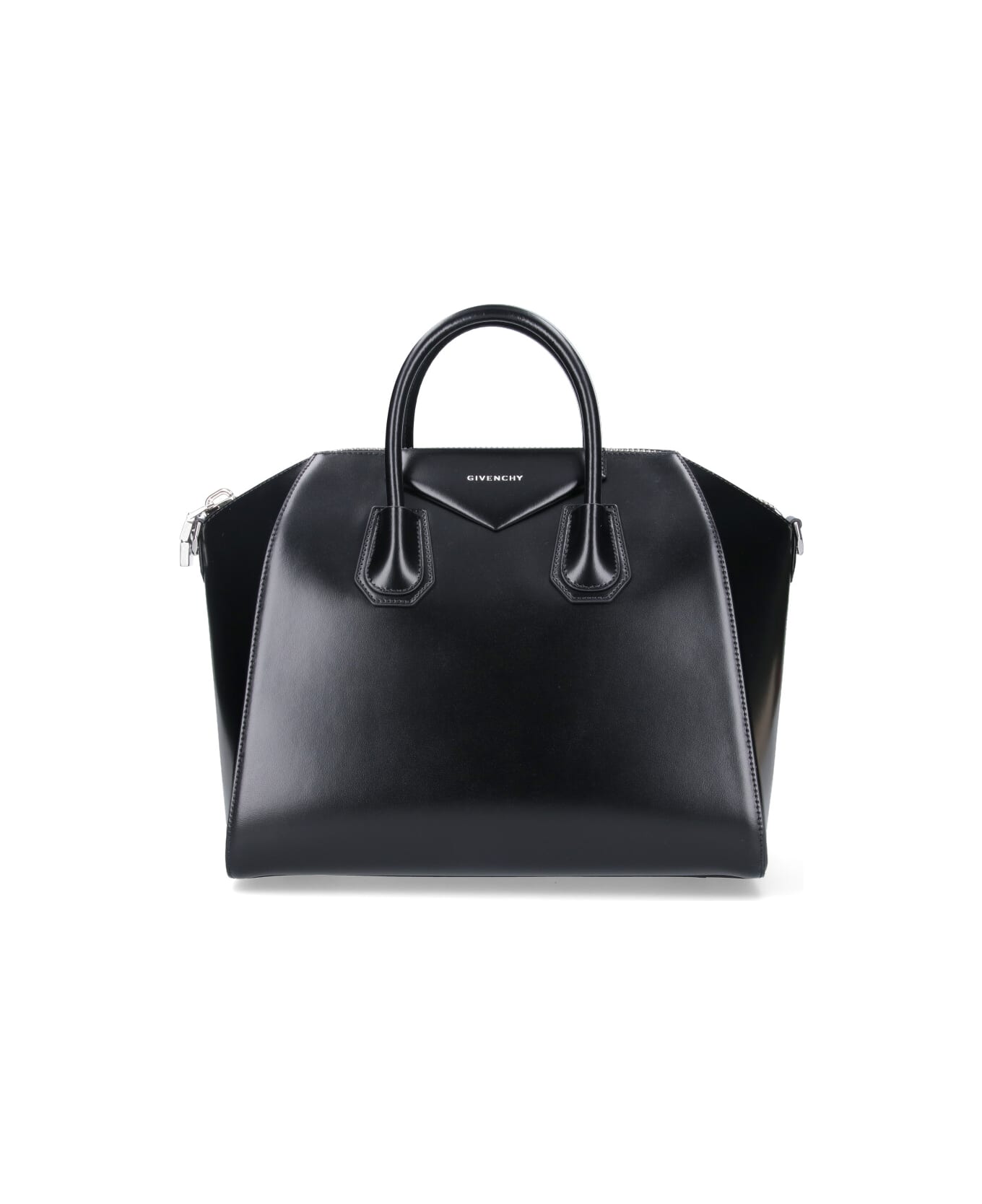 Givenchy medium handbag Antigona in shiny black leather with two top handles, adjustable and removable shoulder strap, zip closure, engraved gold logo on the front, two flat pockets, one inner zip pocket, one main inner compartment, inner lining.