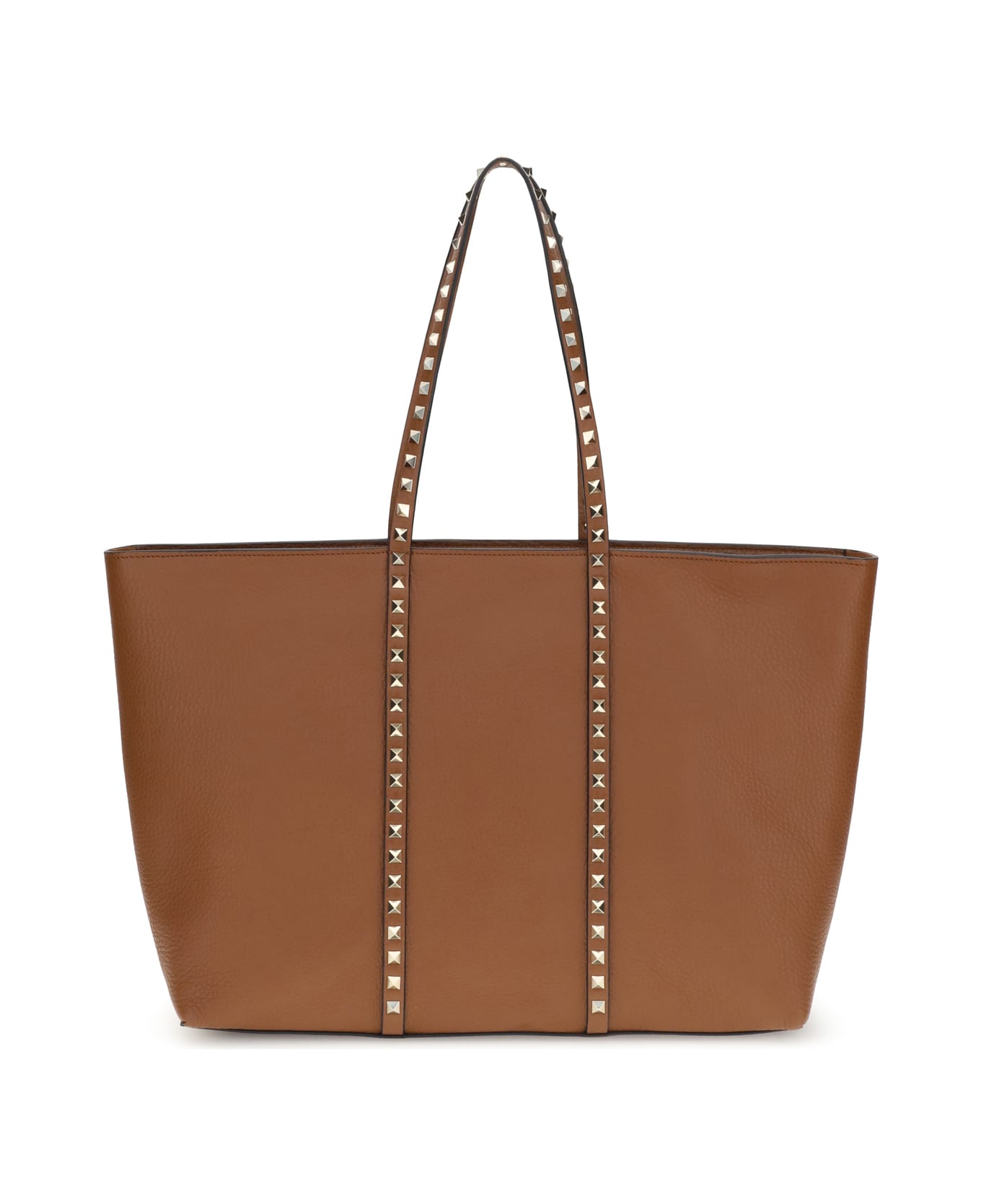 Valentino garavani's medium leather rockstud tote bag, crafted in garnet leather, is a bold and elegant accessory perfect for those seeking a mix of style and functionality. the two handles, embellished with the iconic rockstud studs, add a distinctive touch and a rock-chic accent to both the front and back of the bag. the interior, with a single compartment and zipper closure, provides security and practicality, while the interior zippered pouch offers extra space for storing smaller items.