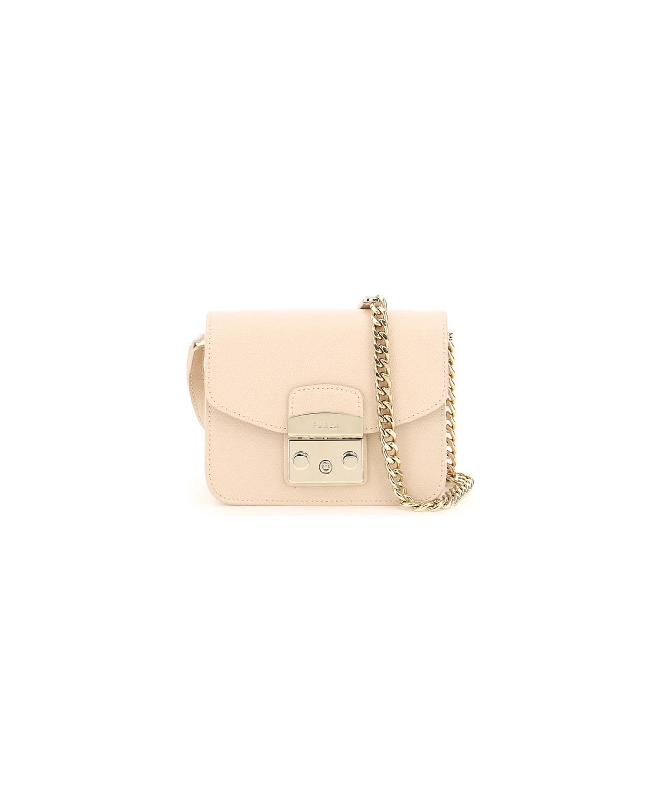 Furla Metropolis Mini bag in grain leather with a structured line with flap and snap closure. Adjustable leather shoulder strap with side chain insert, fabric-lined interior with a flat pocket, protective feet at the base. Gold-tone metalware.