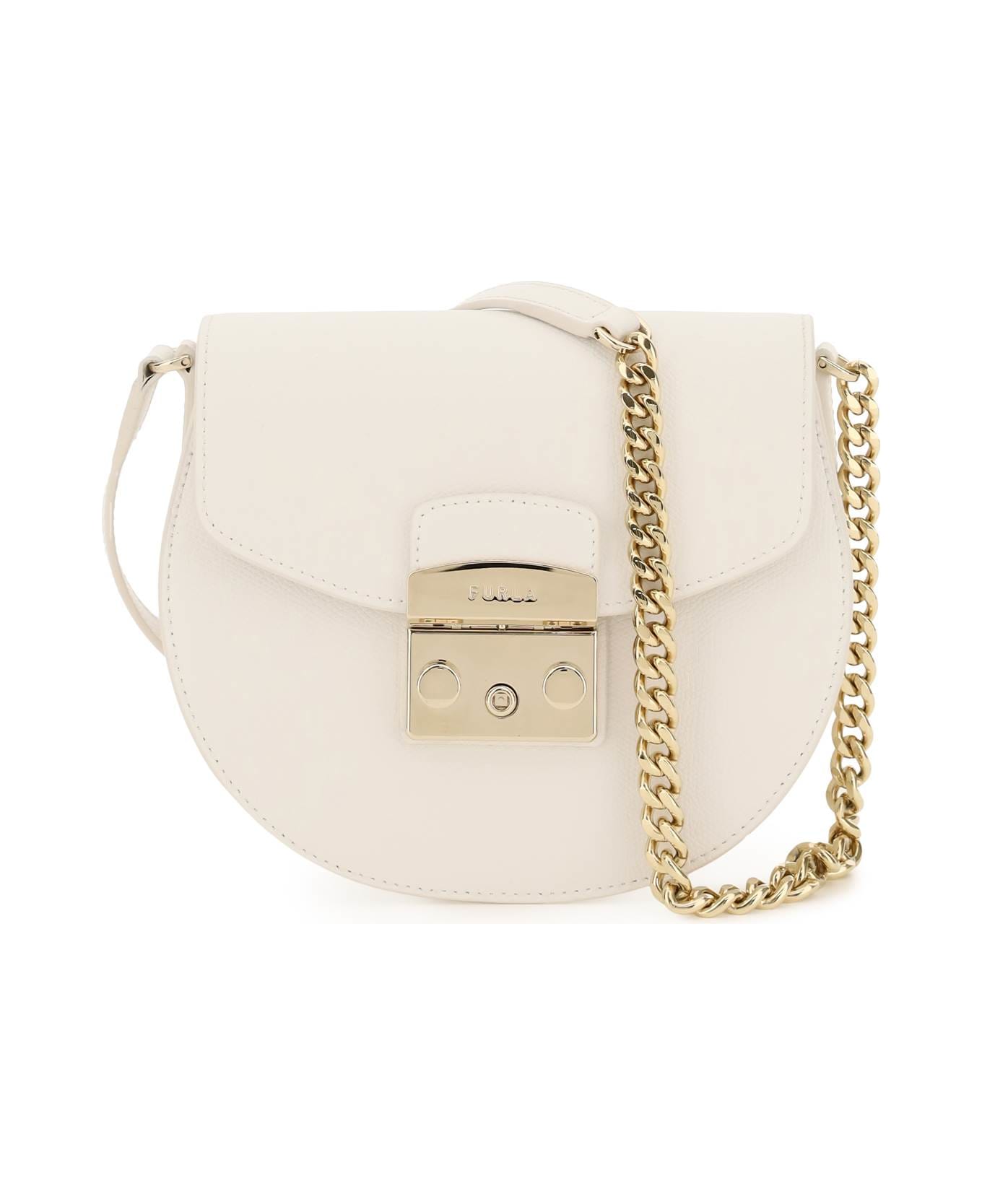 Metropolis crossbody mini bag by Furla, crafted in embossed leather with a round structure. Flap with branded metal snap closure, adjustable leather strap with chain insert, fabric lined interior with an open flat pocket. Gold-finished metalware.