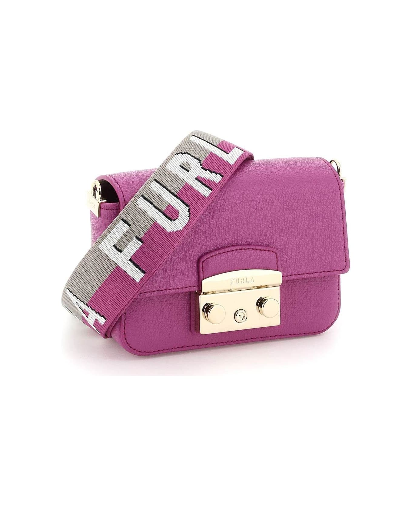 Furla Metropolis Mini bag in leather with a structured line with flap and snap closure. Detachable fabric shoulder strap with jacquard lettering logo, fabric-lined interior with a flat pocket and gold-tone metalware.