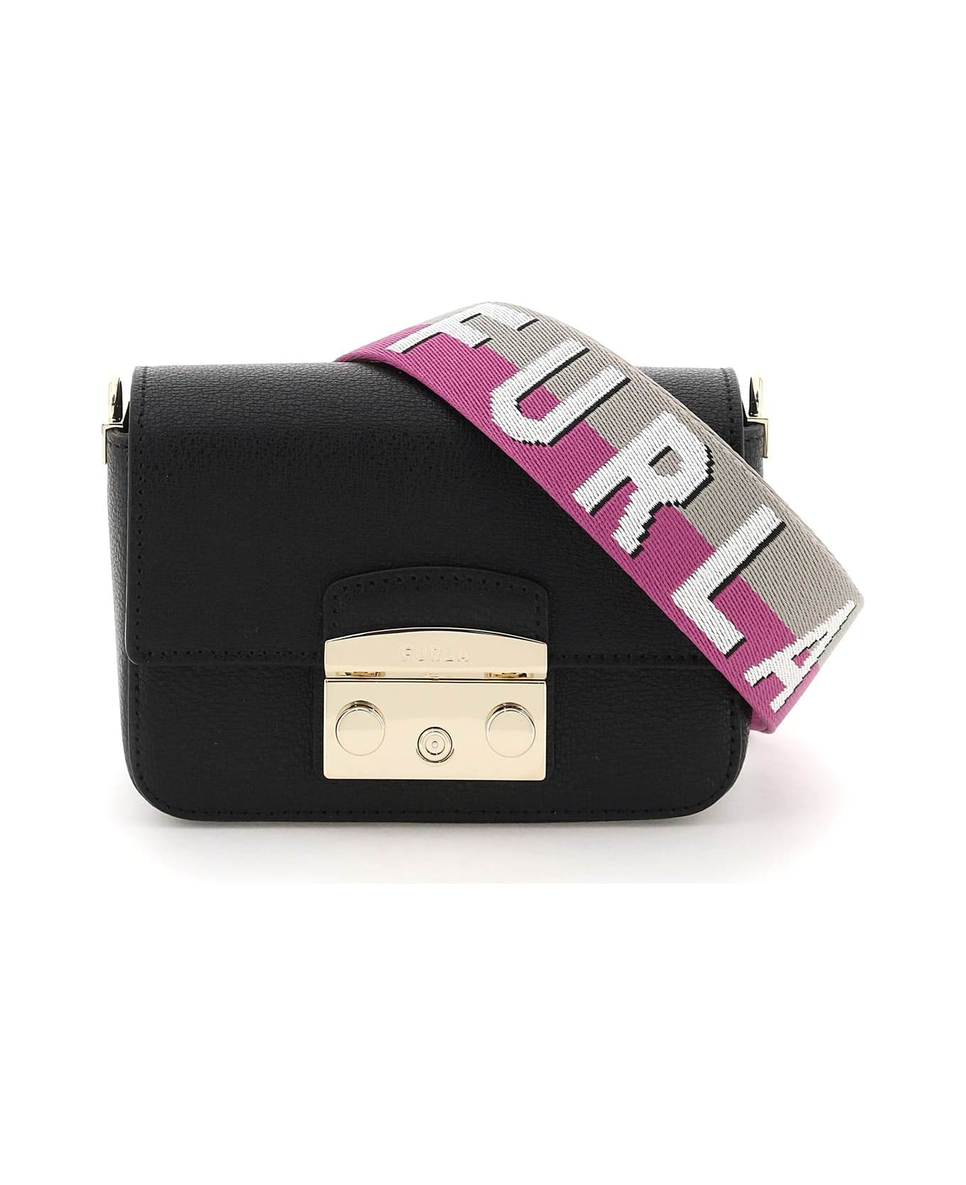 Furla Metropolis Mini bag in leather with a structured line with flap and snap closure. Detachable fabric shoulder strap with jacquard lettering logo, fabric-lined interior with a flat pocket and gold-tone metalware.