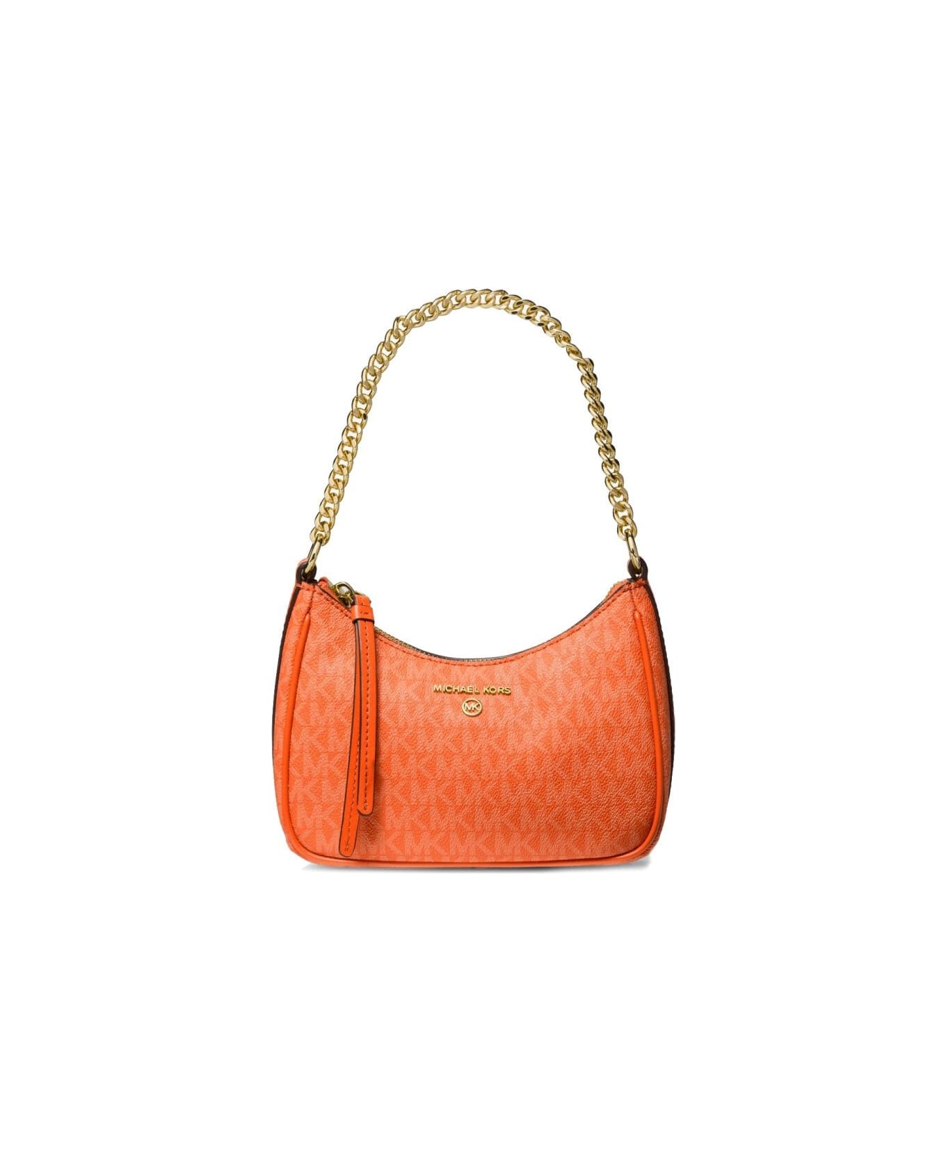 Jet Set Charm shoulder bag by Michael Kors made of orange coated canvas with monogram pattern. Interior equipped with card slots, zip closure and golden metal chain shoulder strap. Logo on the front, measures 20. 5x12x6. 5 cm.