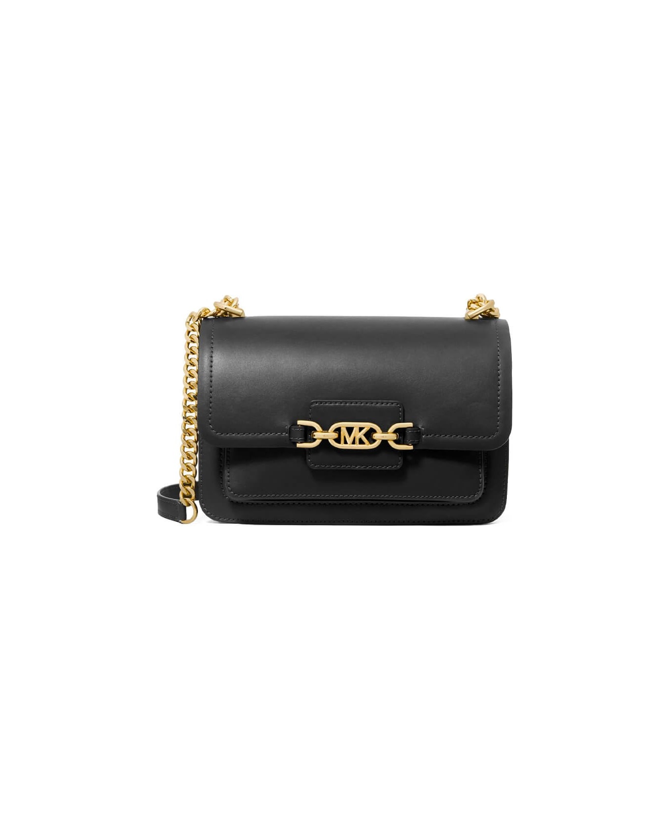 Michael Kors Heater crossbody bag made of black leather. Golden hardware and MK logo on the front. Interior divided into two compartments, one of which with bsutina pockets, magnetic closure. Sliding chain shoulder strap. Measures 23x15x9. 5 cm.