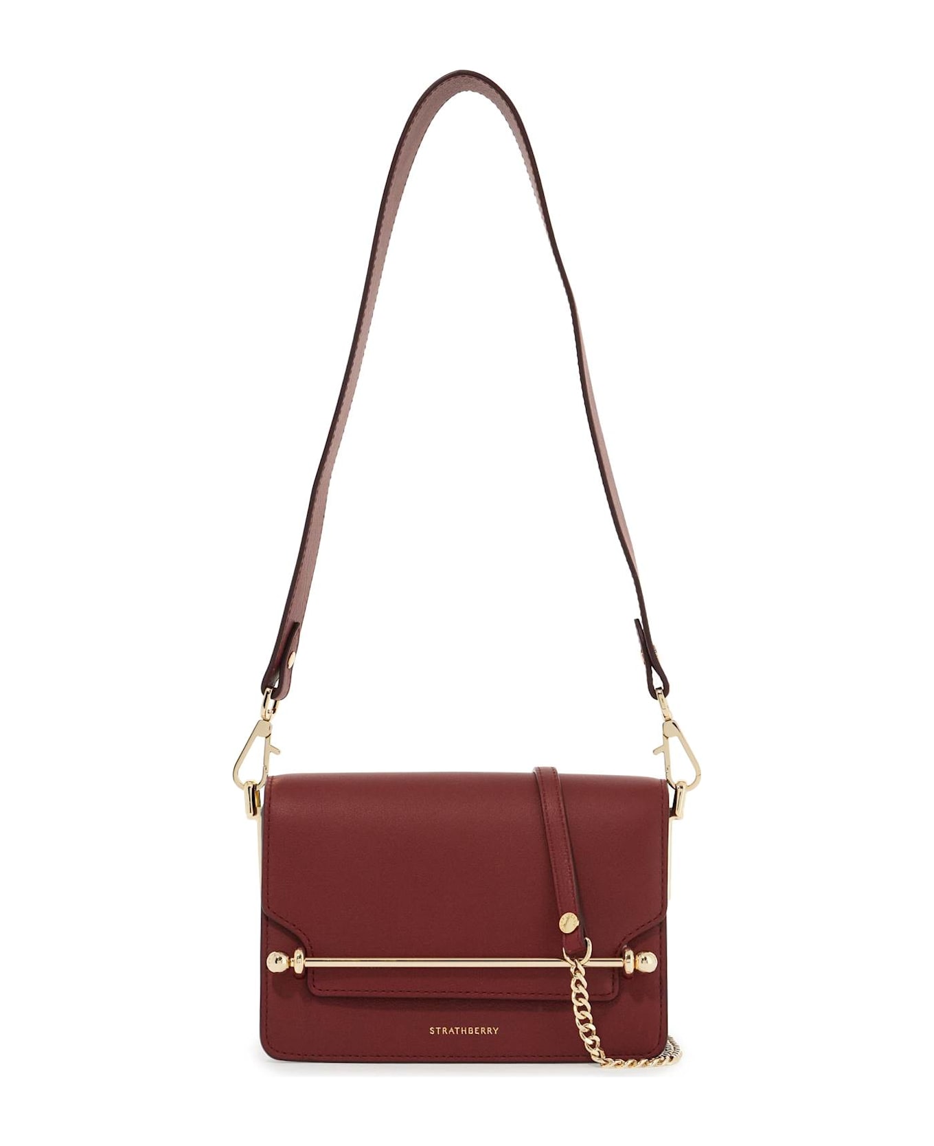 The Strathberry East/West multi-strap bag is handcrafted from calf leather and features the iconic branded metal bar on the front. It has a flap with magnetic closure, a printed logo on the front, and a microfiber suede-lined interior with a flat pocket. The bag comes with both a removable handle and shoulder strap for a crossbody or shoulder look. All metallic accessories have a gold finish.