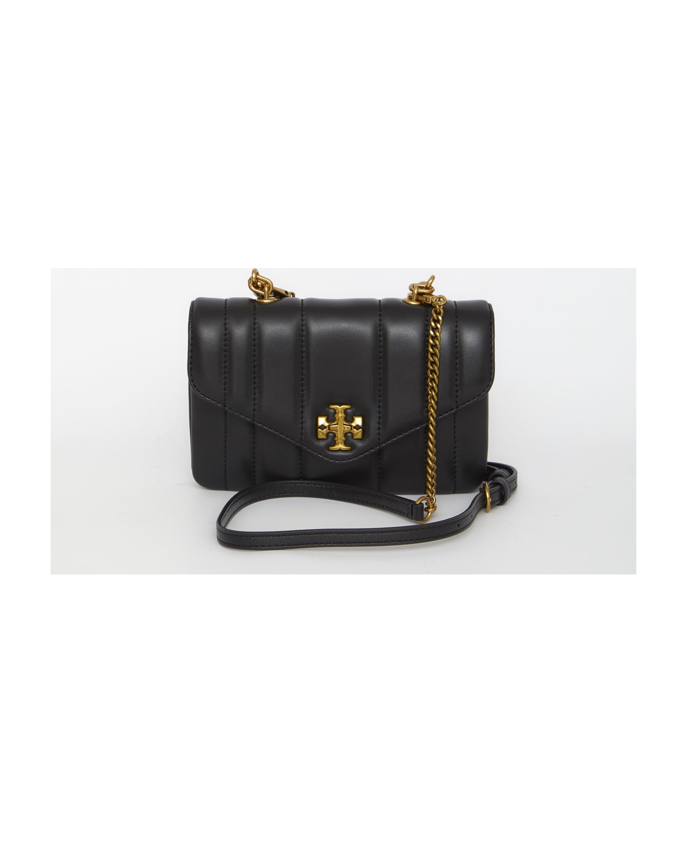 Mini Kira Top Handle bag in soft black quilted leather. It features gold-tone metal Double T logo on the front, detachable top handle, adjustable and detachable leather and chain shoulder strap, front flap with turn-lock closure, two main interior compartments separated by a zip pocket and three interior card slots.