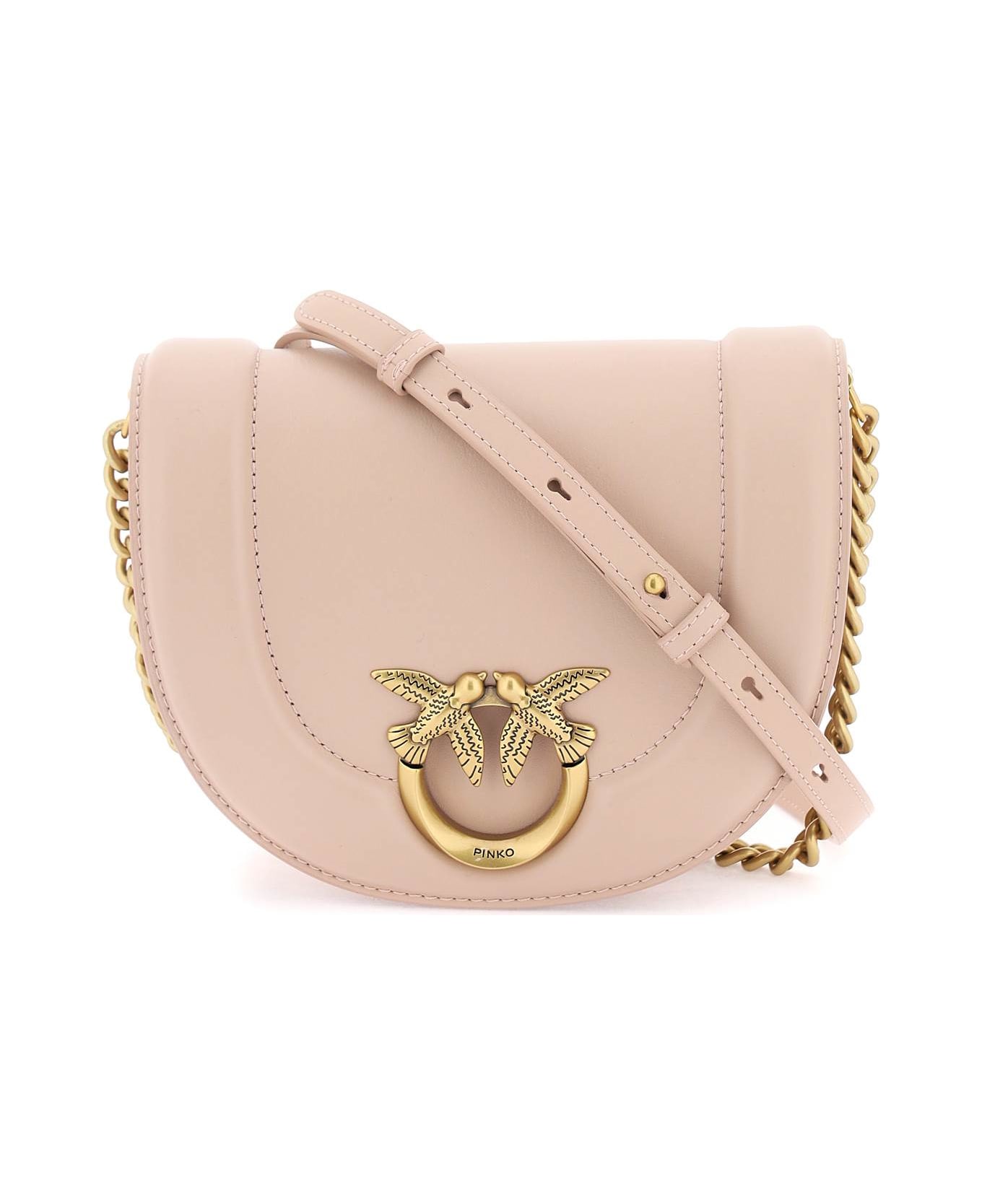 The Mini Love Bag Click shoulder bag by Pinko is made of smooth leather with padded edges and decorated with the iconic Love Birds Diamond Cut buckle in antique gold metal. Its rounded shape features a magnetic flap closure, while the microfiber-lined interior has a main compartment with card slots and two slip pockets. The strap combines a classic golden chain with an adjustable leather shoulder pad.