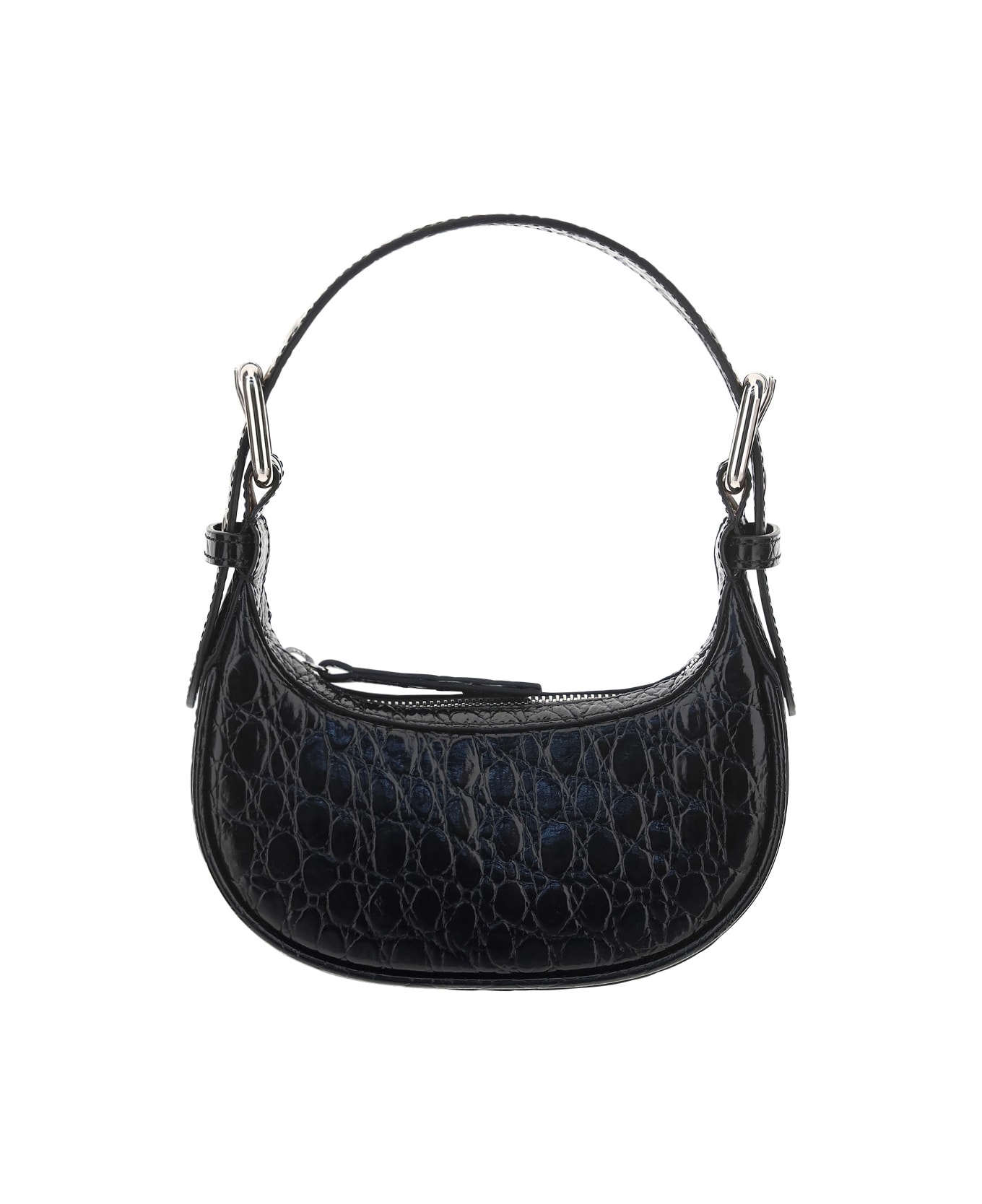 Calfskin mini soho bag by by far, curved silhouette, oversized double sheath metal buckles, multiple eyelets, top zipper closure, interior welt pocket.