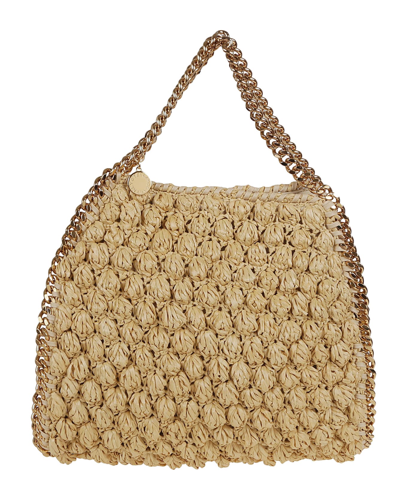Classic Falabella mini tote Popcorn Raffia Crochet, a must of the Stella McCartney brand present in all seasons with the color variant. Featuring a gold chain that follows the perimeter of the bag forming the handles on the top, plus a third chain that allows the bag to be worn over the shoulder, Stella McCartney logo medal, snap button closure. Ideal to be worn both sporty during the day with sneakers and in the evening with a more elegant and feminine outfit.