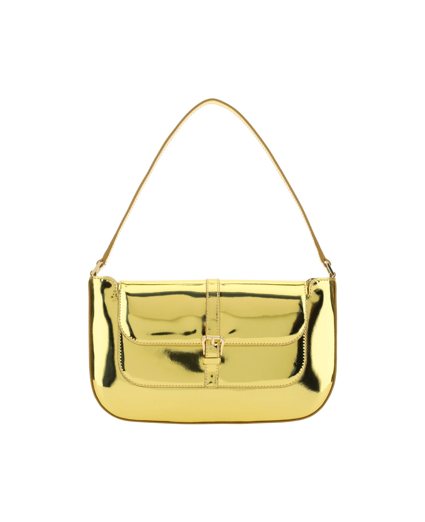 Miranda bag by by far, single top handle, front snap button closure, inside welt pocket with brand logo plaque, mirror effect design.