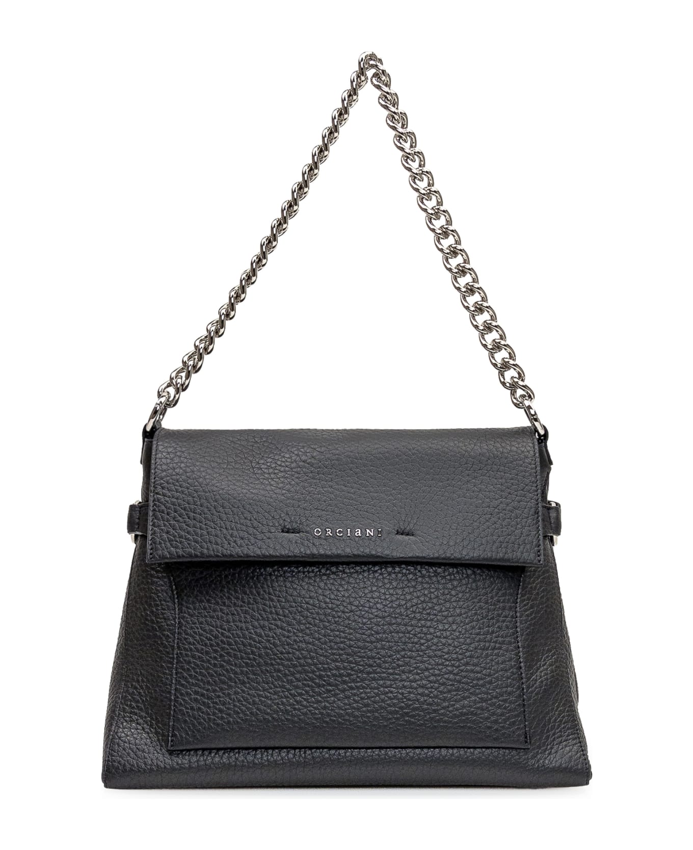 Black leather shoulder bag. A handle with removable chain. Removable and adjustable shoulder strap. Two external pockets. Magnetic closure under flap. Logo on the front.