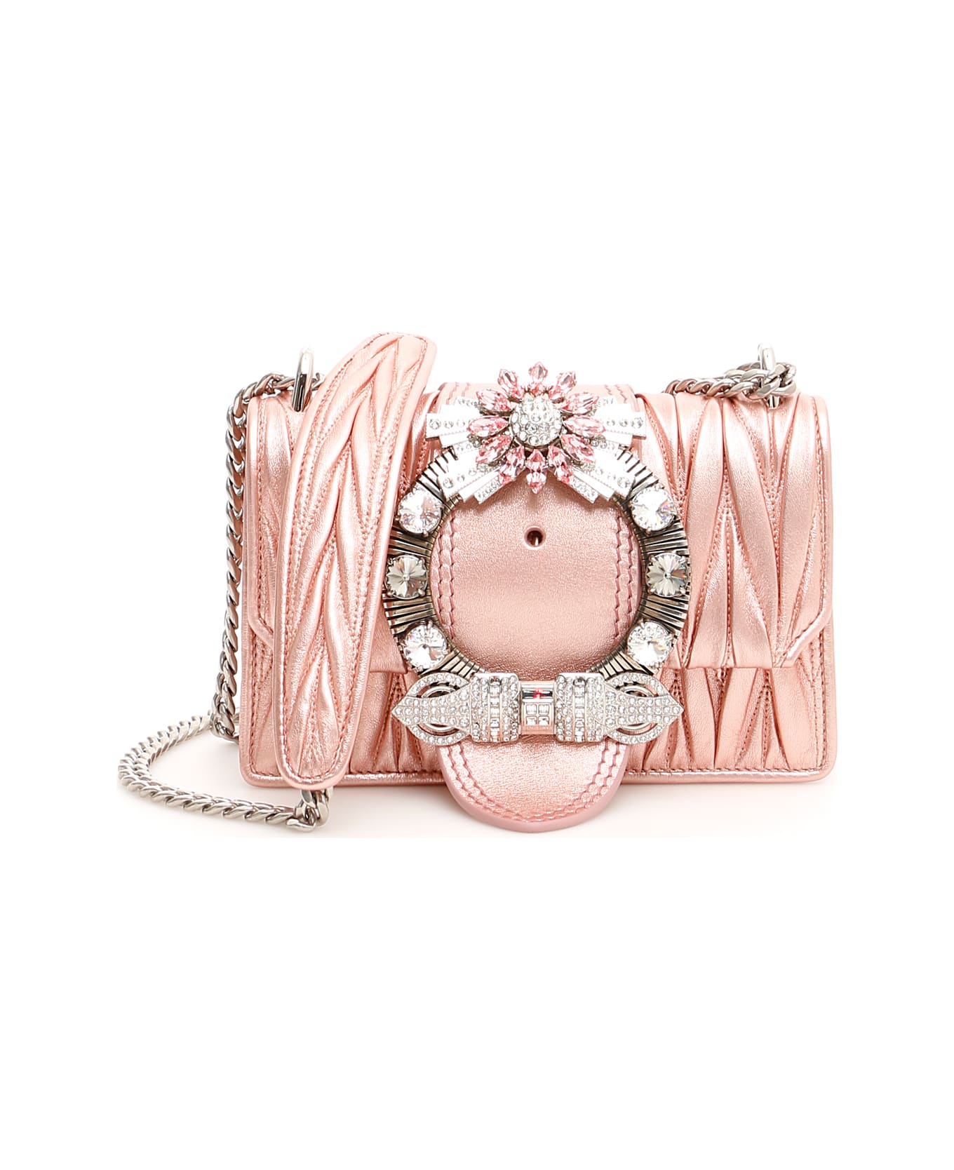 Miu Miu metallic quilted nappa Miu Lady bag. It features a sliding chain strap with leather insert and an embellished buckle on the flap. Magnetic button closure, fabric and leather lining, inside patch pocket, silver-tone metal logo and hardware.
