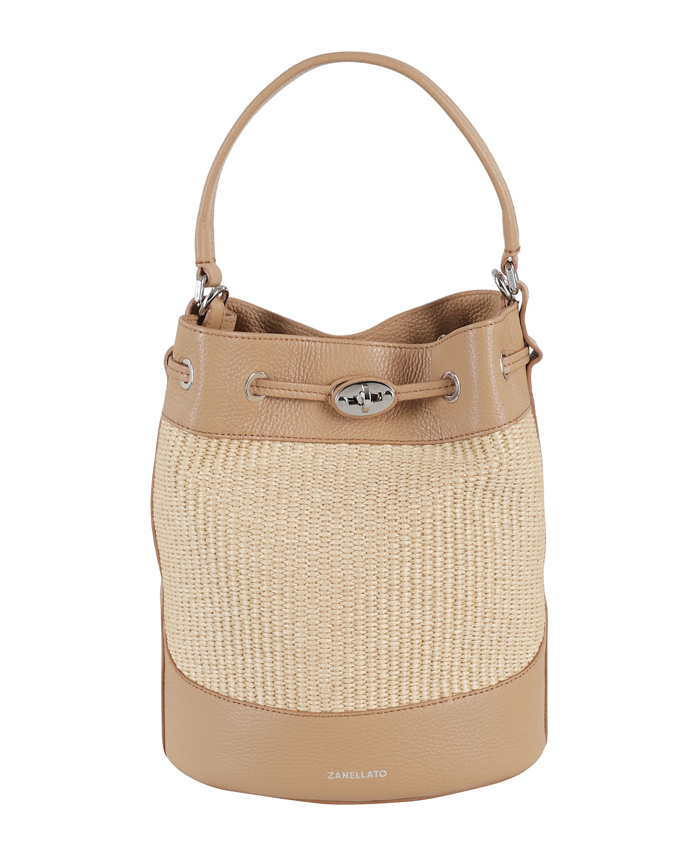 Mondà Wicker Bag - Zanellato - Almond color - Made of wicker - Bucket design - Hammered leather inserts - Top handle - Adjustable and removable shoulder strap - Interior magnetic closure - Dimensions: 28 x 29 x 14 cm.