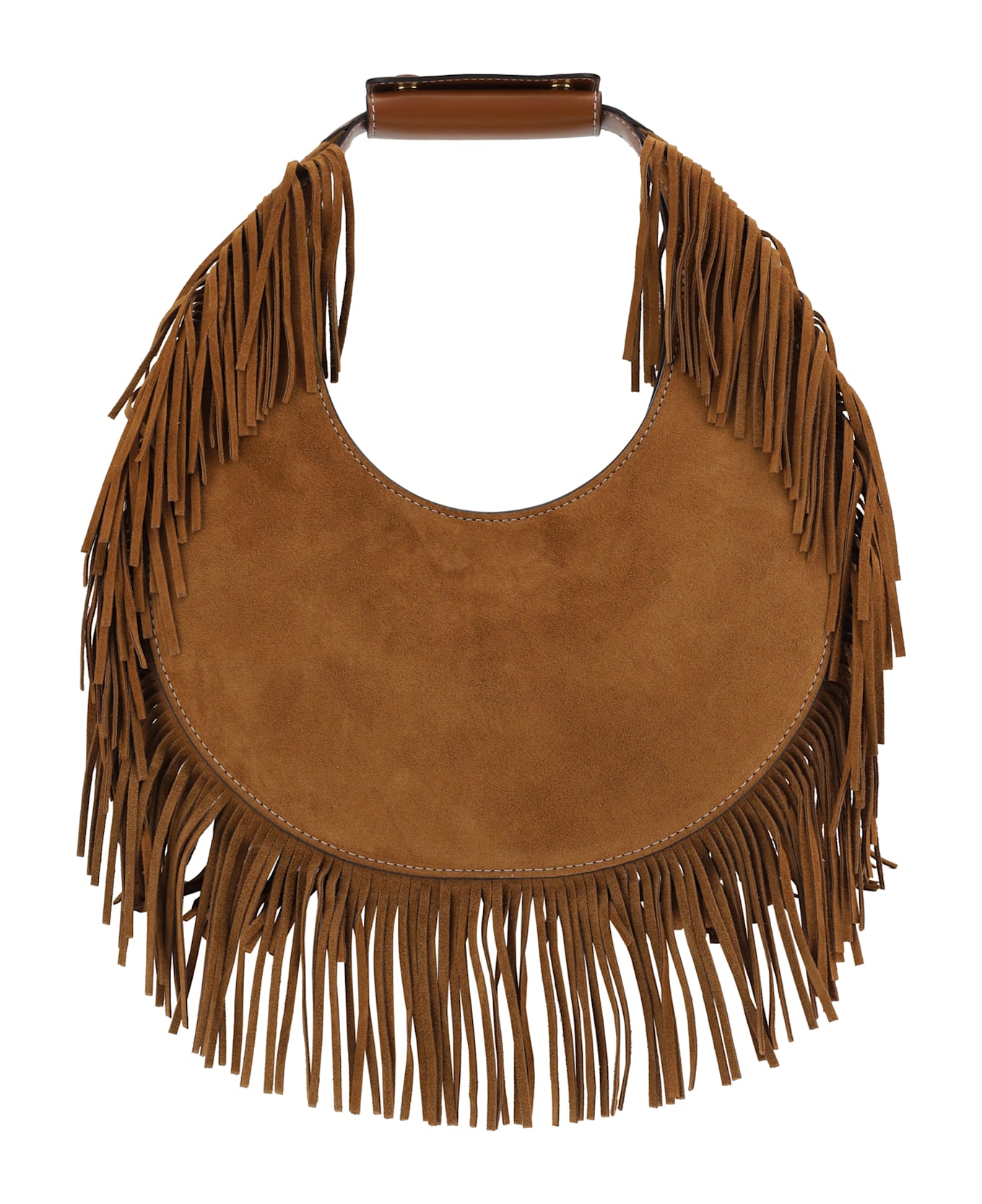 Staud's moon shoulder bag is a boho-chic style, featuring a suede design embellished with decorative bangs. the stiff handle gives it a structured feel, while the hidden magnetic closure provides practicality while maintaining a clean and elegant aesthetic.